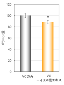 ヒト正常表皮色素細胞をVCとイリス根エキスを含む培養液で培養し、5日後に細胞を回収し細胞内のメラニン量を測定し比較した。ビタミンC単独の場合のメラニン合成量を100%とした。