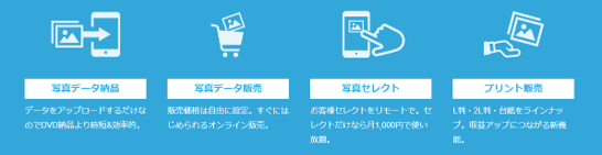 納品機能に加え、有料販売やフォトアルバムに使用する写真をお客様に選んでいただくセレクト機能など、フォトグラファー様のご要望に沿える機能を豊富に備えています。