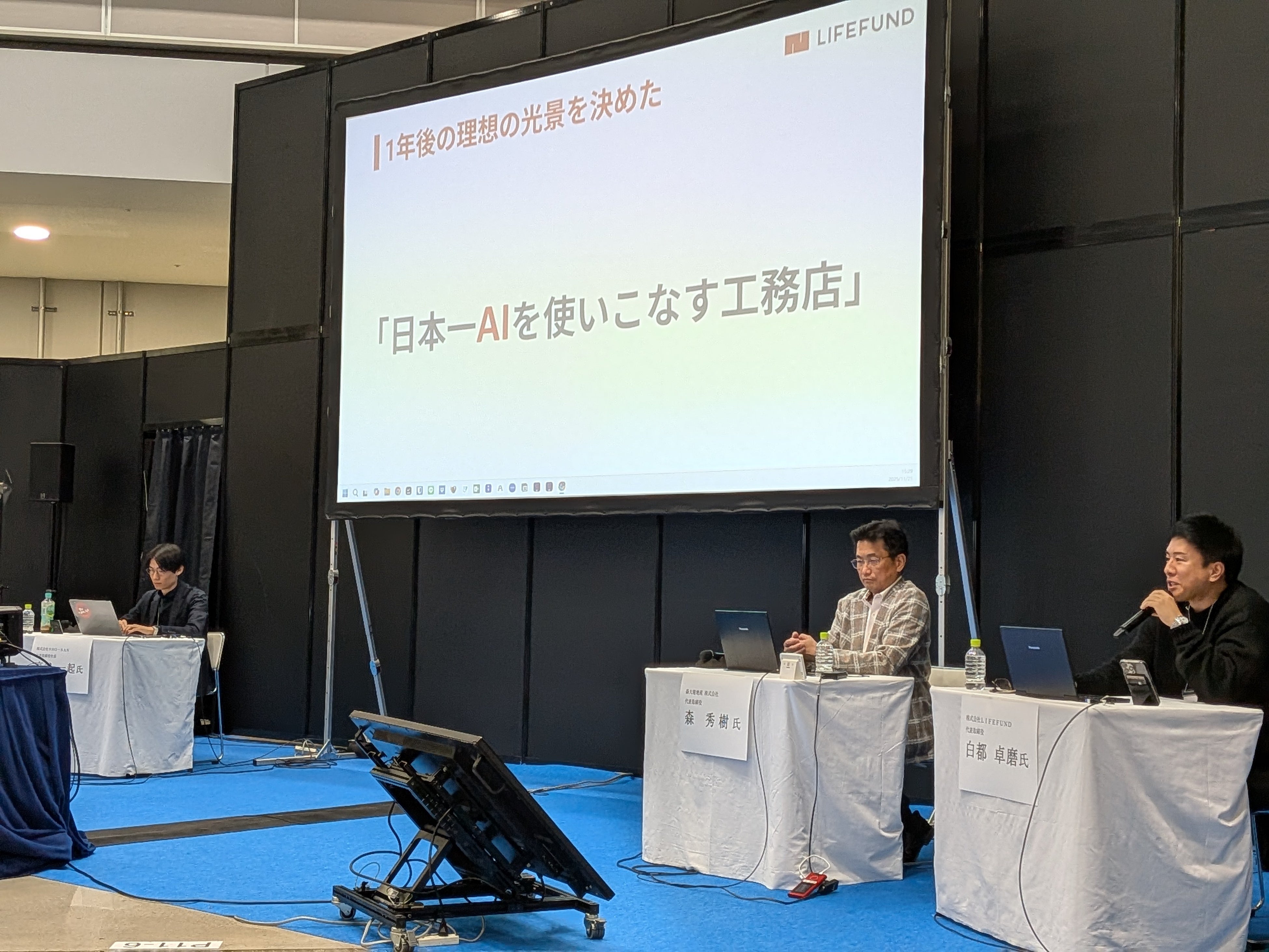 11/21に開催された「Japan Home Show & Building Show 2025」の「工務店経営会議2025」(主催:新建ハウジング、協賛:SHO-SAN)のうち、株式会社LIFEFUND(静岡県浜松市)代表取締役・白都卓磨が登壇したセッションは、オンライン参・現地参加を含め、総勢690名の建築業界関係者にご参加いただきました。 現地で参加された方からは「人手不足の建築業界だからこそAIを活用する必要性を感じた」「建築業で活用できるAI仕事術を学びたい」といった高評価をいただきました。