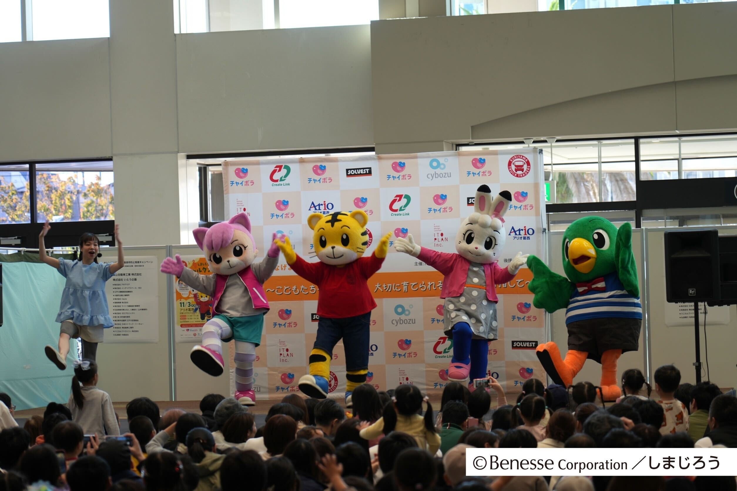 『しまじろう スペシャルダンスショー』~みんなで おどって なかよくなろう!~幼児親子に人気の「しまじろう」「みみりん」「とりっぴい」「にゃっきい」が登場するステージショー は、早朝より整理券に並ぶ列ができ、各回100組の着席に加えて立ち見も出る盛況ぶりでした。2回の公演の合計で、約1,600名が観覧してくださいました。人形を片手に目を輝かせて声援を送るお子さんが多く見られ、「しまじろう」のステージショーの終了後には他のイベントに参加する家族も多く、イベント全体のリレーションを高める効果がありました。