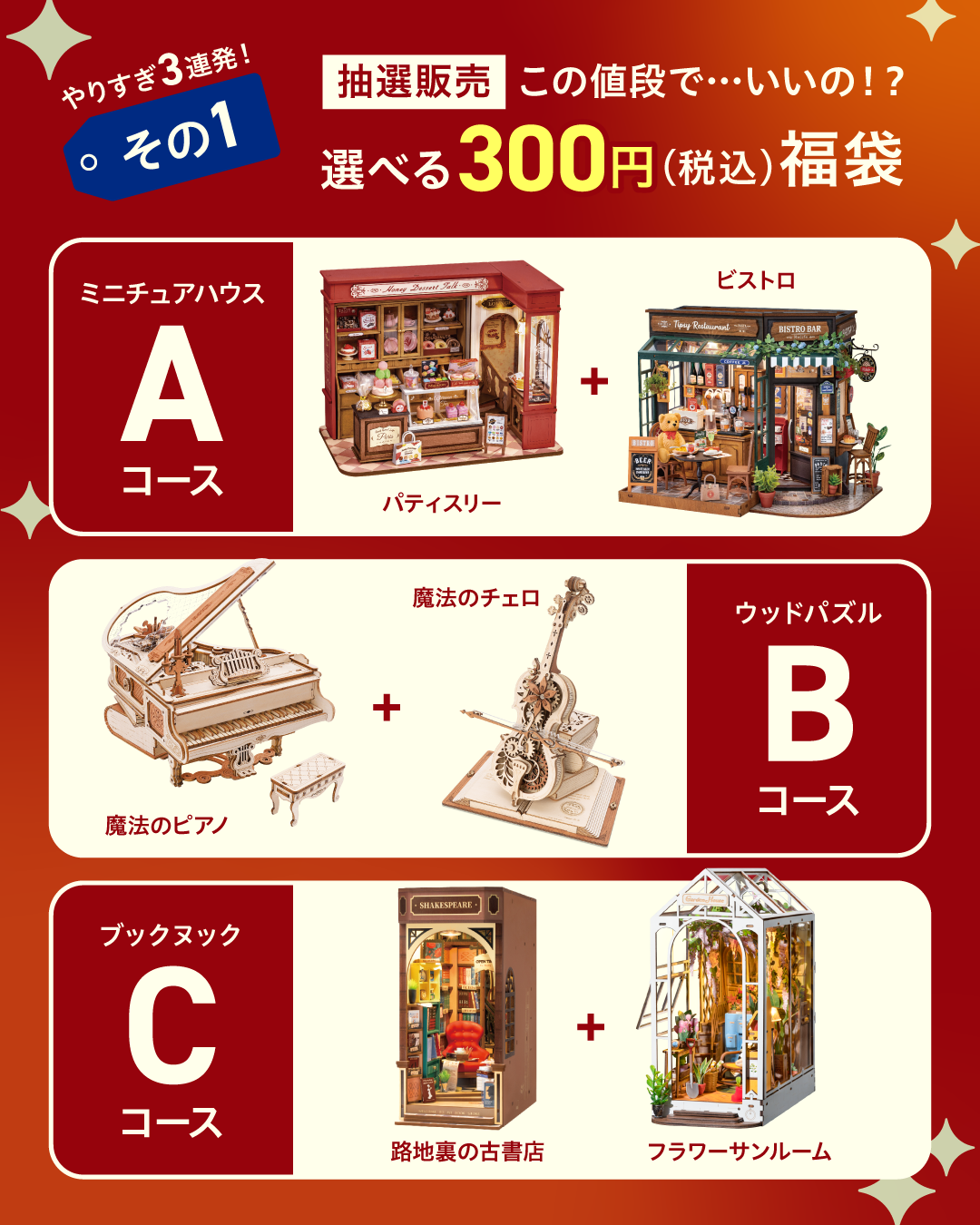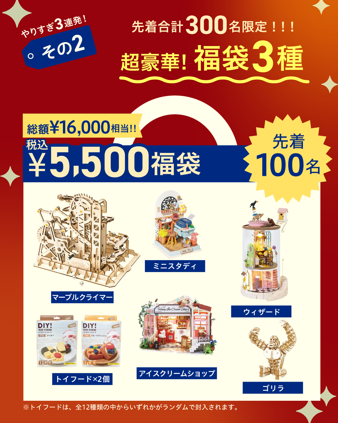 今回、300万個突破と7周年を記念し、公式オンラインショップ「つくるんです本店」で 限定福袋(抽選販売・先着販売) と ミニチュアハウス・ウッドパズル15%OFFセール(一部除外) を期間限定で開催します。