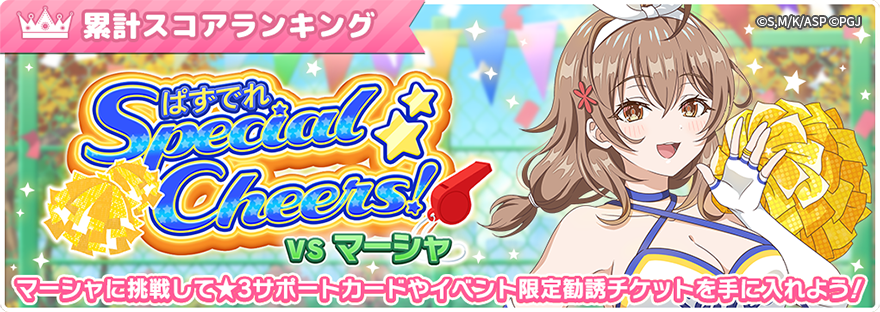 「ぱずでれスペシャルチアーズ!VSマーシャ」に向けて開催される、期間限定の特効勧誘では、チアガール姿のアーリャと有希と茅咲の3人が登場します。