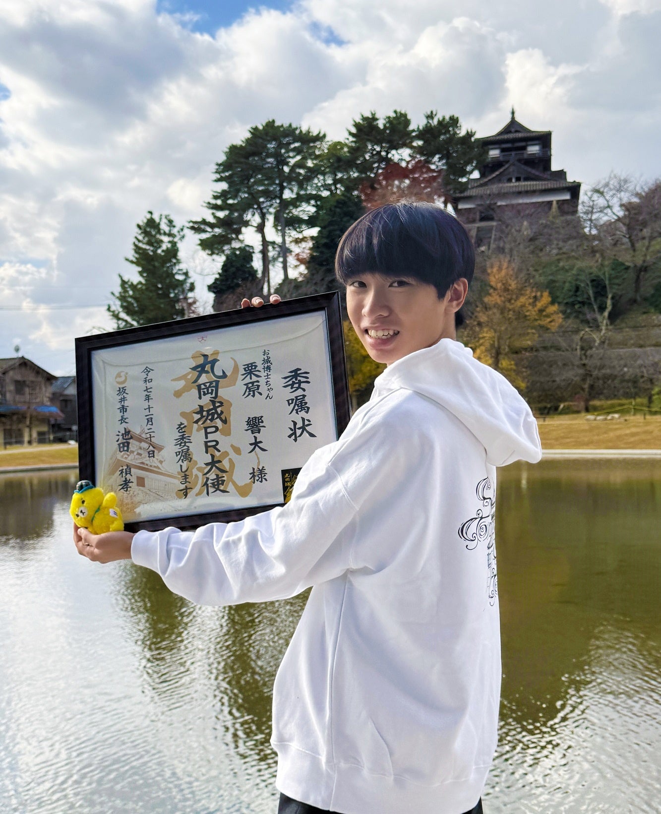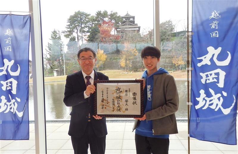 現存十二天守のひとつ、丸岡城がある福井県坂井市は11月28日、テレビなどで活躍し“お城博士ちゃん”として知られる、栗原響大さん(神奈川県横浜市在住)に「丸岡城PR大使」を委嘱した。丸岡城PR大使としては、お笑いタレントの田村淳さんに続いて2人目。丸岡城天守を見上げる同市の丸岡城観光情報センター「マチヨリ」で、池田禎孝市長から委嘱状を受け取った栗原さんは「丸岡城は天守倒壊などいくどもの困難を乗り越えてきたお城。このような大役に任命していただき光栄。北陸新幹線も福井まで開通し、アクセスしやくなったので、知名度を今以上に挙げていきたい」と今後のPR活動に意欲を見せた。