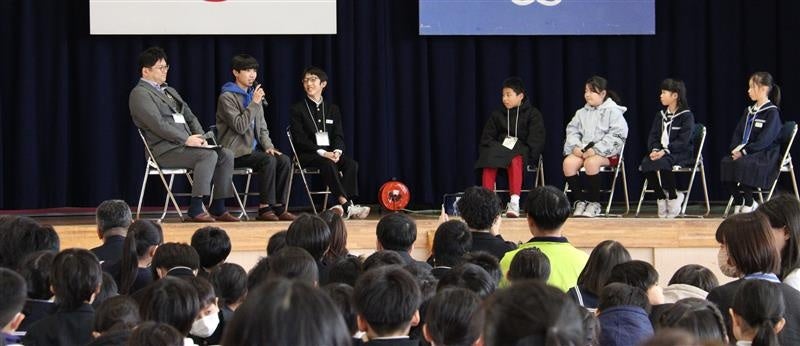 栗原さん(左から2人目)と地元児童生徒によるトーク会=平章小学校