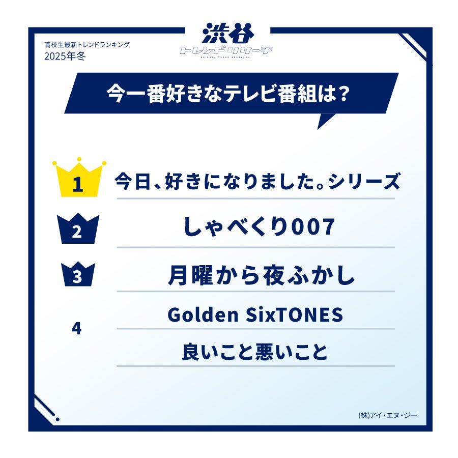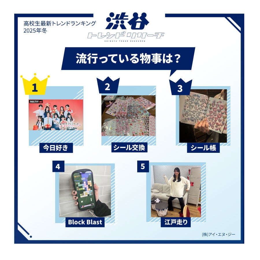 ABEMAの人気番組「今日、好きになりました。」を略した「今日好き」が、本ランキングで初の1位に輝きました。本調査の夏の特大号で3位にランクインして以降、勢いが衰えることなく人気を継続しています。「毎週月曜日の楽しみ」(高2・女子)、「みんな観てる」(高3・女子)といった声が多く寄せられ、“今日好きブーム”が加速している様子が伺えます。2位は「シール交換」。 「TikTokでインフルエンサーがやってるのをよく見る」(高2・女子)、「懐かしい!平成ブームでまた流行ってる」(高3・女子)など、根強く続く“平成女児ブーム”の延長で、当時人気だったシールやキャラクターシールを交換する文化が再燃。Z世代の間で空前のブームとなっています。3位は、シール交換と関連した「シール帳」がランクイン。 「作るのが楽しい」(高3・女子)、「いつも持ち歩いてる」(高1・女子)といった声が多く、懐かしさと“自分だけの世界観を作れる”という楽しさが高校生の心を掴んでいます。シール・シール帳ともに文具店やネットショップで品切れが続出するなど、社会現象になっています。