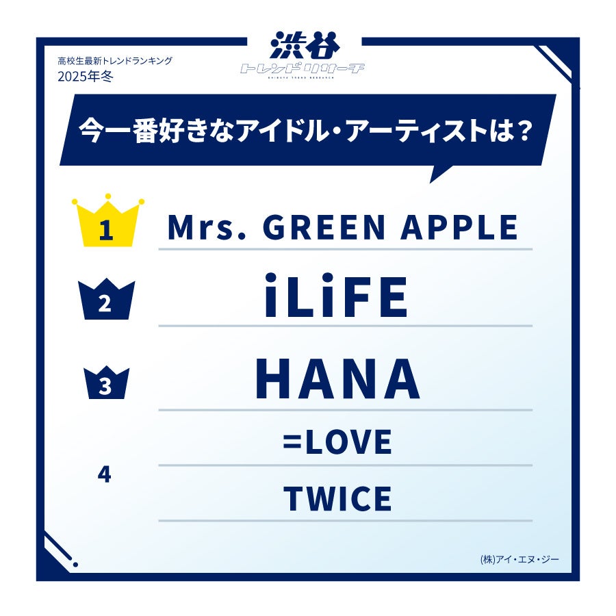 今回も「Mrs. GREEN APPLE」が堂々の1位を獲得。「彼らの音楽に救われた」(高1・男子)といった声が多く寄せられたほか、「年明けからフェーズ3に突入するなど、エンタメが盛りだくさんで追っていて楽しい」(高3・女子)といったコメントもあり、楽曲だけでなく俳優・バラエティ出演など幅広い活躍も人気に寄与している様子がうかがえます。2位も前回に続き、9人組女性アイドルグループ「iLiFE!」がランクイン。「可愛くてキラキラしていて憧れる」(高3・女子)といったコメントが目立ち、女子高校生から強い支持を集めています。