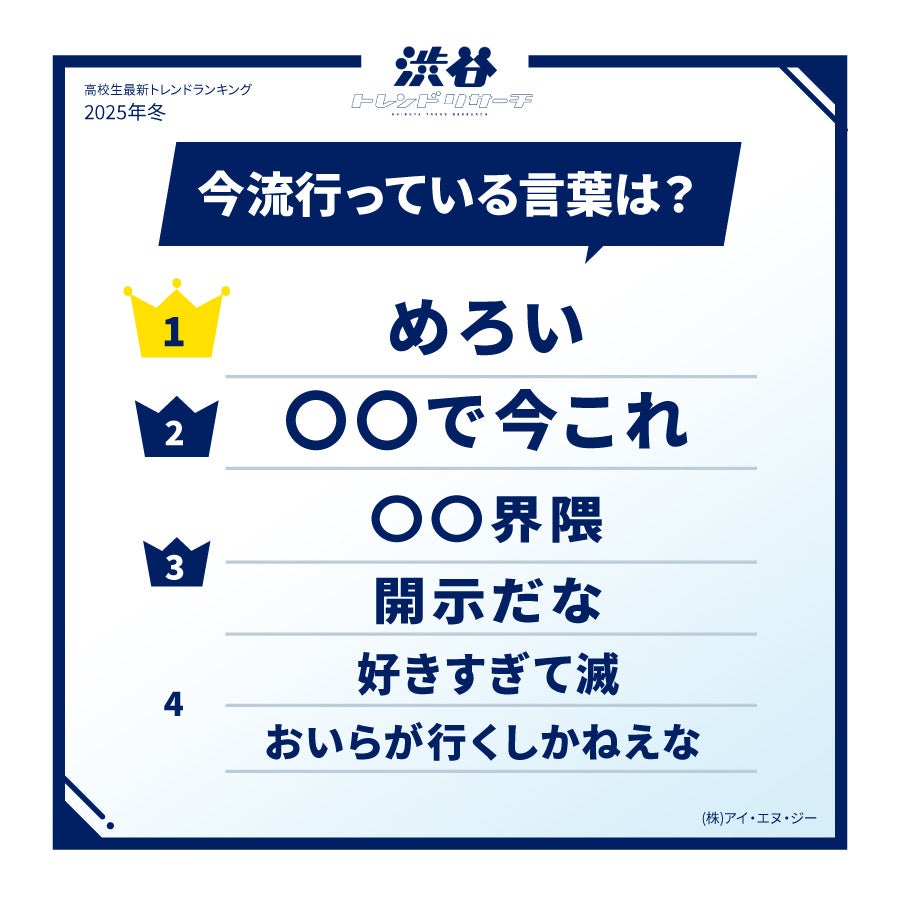 「めろい」が1位を獲得しました。語源は「メロメロになる」で、「メロメロになるほどかっこいい・かわいい」という意味で使用されています。「みんなSNSを見ながら口々にそう言う」(高3・女子)や、「TikTokでメロい女の子になる方法とかよく流れてくる」(高2・女子)などのコメントが寄せられ、"すごくかわいい"を表現する際に日常的に使われている様子が伺えます。2位は、秋の特大号で1位だった「〇〇で今これ」でした。「今まさにコレ!」という気持ちを端的に表現する際に言葉だけを切り取って日常的に使われており、日常使いをはじめ、SNSでも流行中です。3位には「〇〇界隈」と「開示だな」が同率ランクイン。「〇〇界隈」は、昨年から引き続きリアルな会話や投稿で使用されており、「〇〇界隈ヤバい」や「推し界隈」という形で身近な話題を親しみを込めて語るフレーズとして浸透しています。「開示だな」は、相手の言動が過度になった場合に冗談交じりに制止する際に使われるネットスラングで、YouTuberの「ヒカキン」が動画内で発した言葉がSNSを中心に拡散され、使われています。