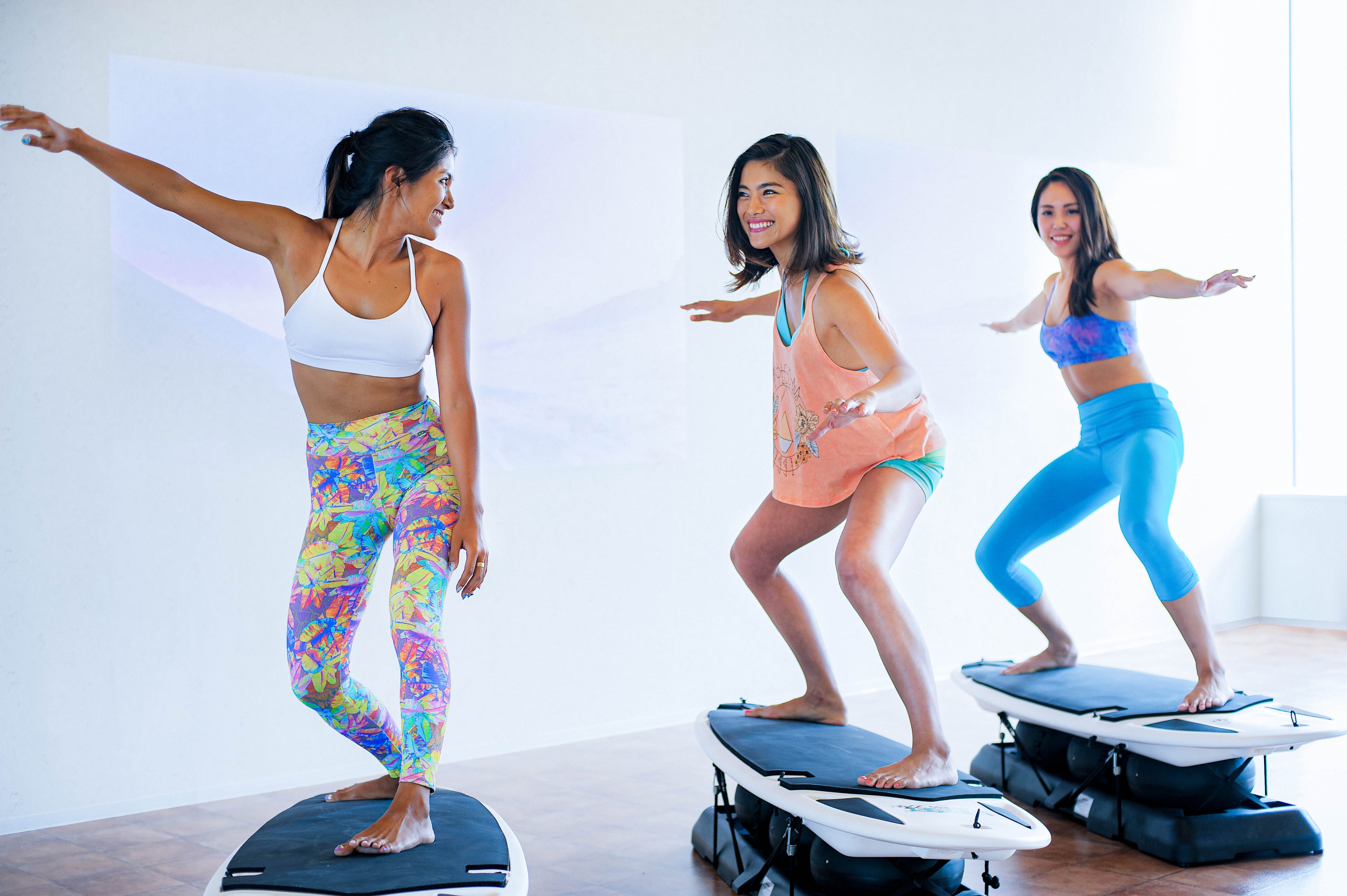 西海岸をイメージさせる店内と、夏のビーチの気温に合わせたスタジオは海に行けない多忙な女性たちを都会の真ん中でサーフトリップ。ゆらゆら揺れるボードの上で、アップチューンの音楽にあわせて体幹を鍛えるサーフエクササイズで、楽しくシェイプアップできます。全国2店舗展開(2025年11月時点)