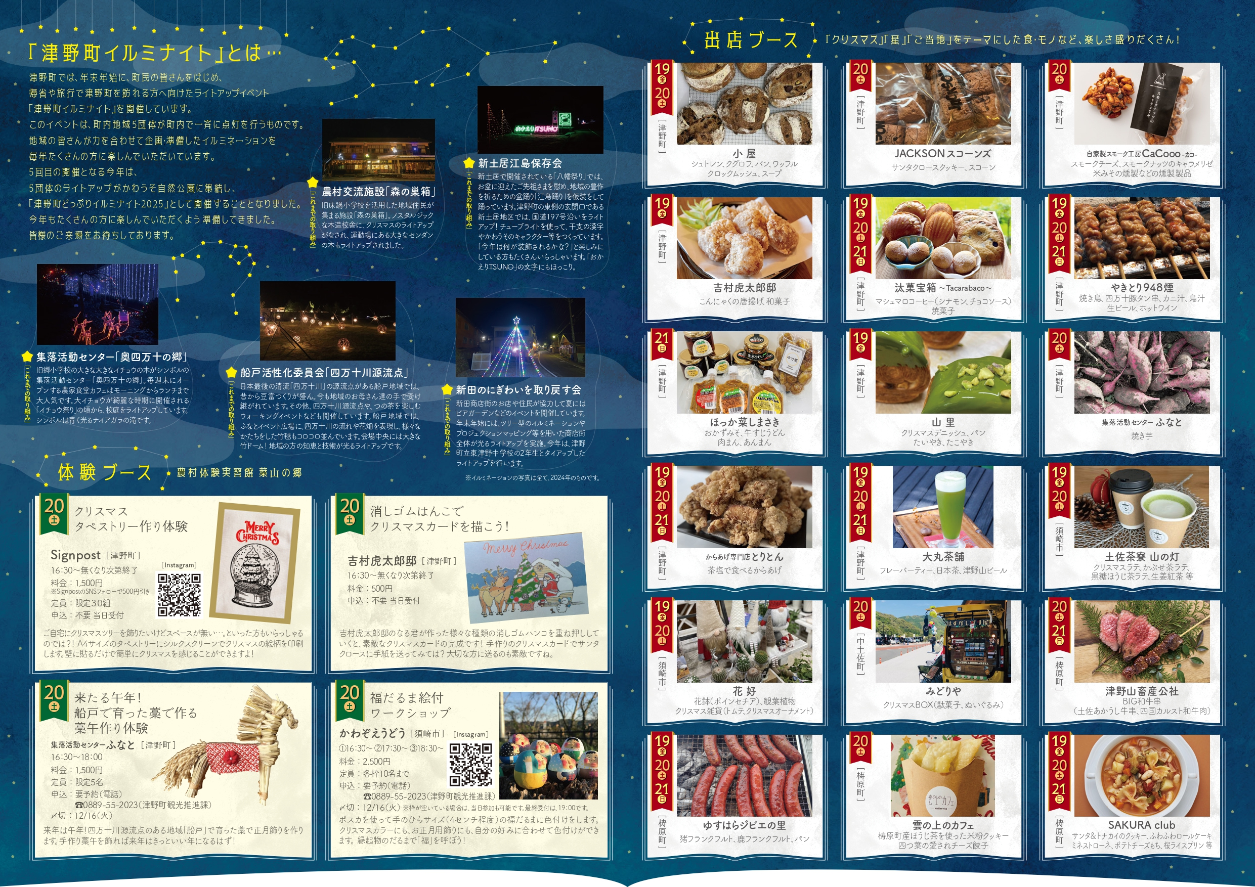 3日間通して、17時~21時までライトアップを実施!出店や体験ブースでは奥四万十エリア人気の飲食・ワークショップが楽しめます!奥四万十が贈る特別なクリスマスを過ごしてみませんか?