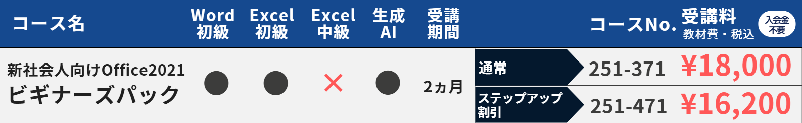 新社会人や就職活動中の学生を対象に、ビジネスに不可欠なOfficeスキルと注目の生成AI活用スキルを短期間で習得できる期間限定のパックです。新社会人に限らず、デジタル時代を勝ち抜くために必要な実践的なスキルを身につけたい方にもおすすめです。<キャンペーン期間>