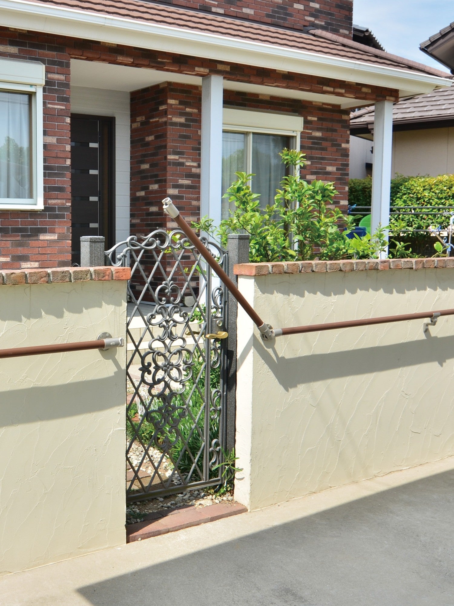 屋外用手すりシリーズ「フリーRレール」の遮断機式支柱。車庫への動線があっても、手すりを途切れさせない。