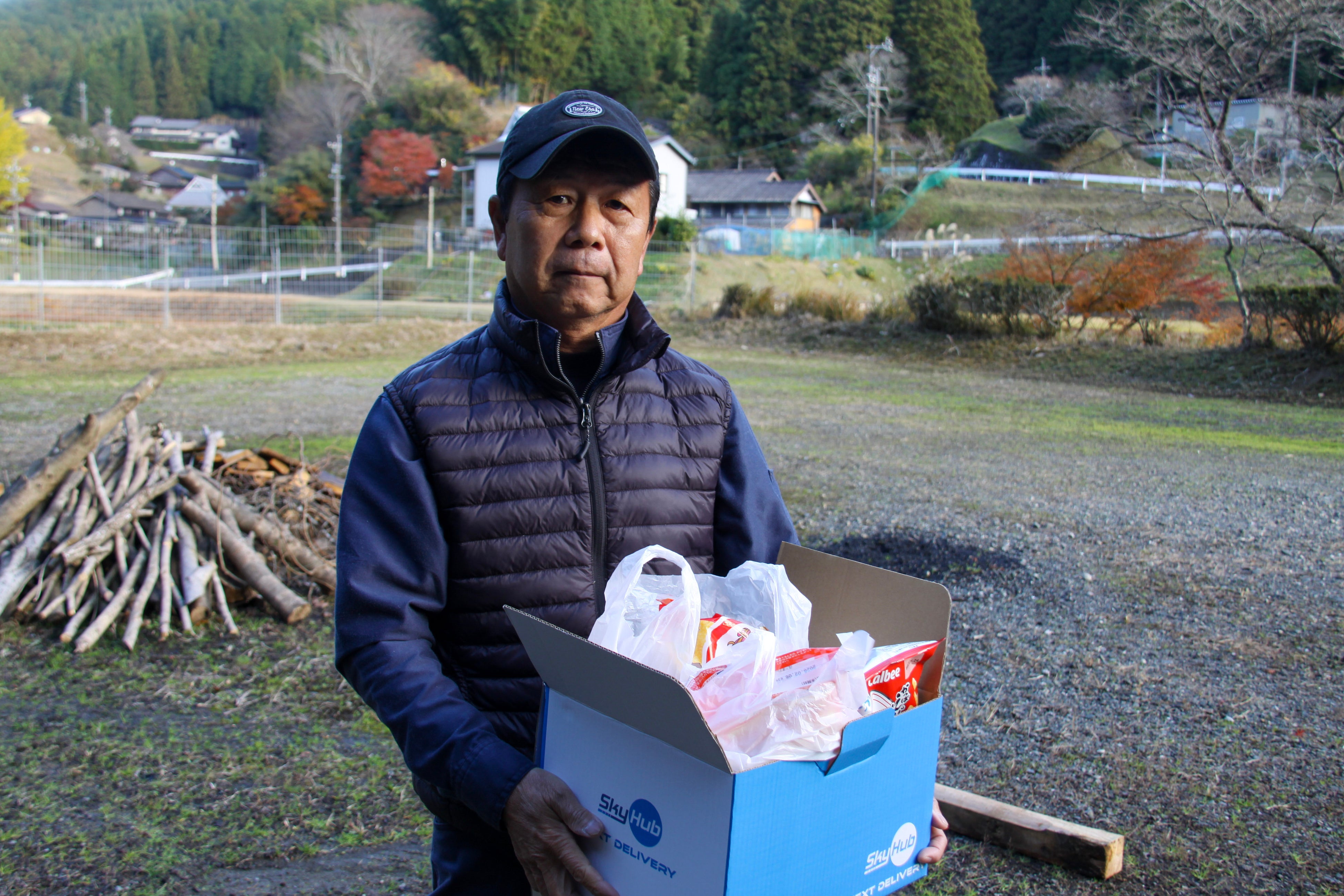 ドローンで配送されたAコープ注文品と宅配荷物(ダミー)を受け取った地域住民の竹下勝之さん