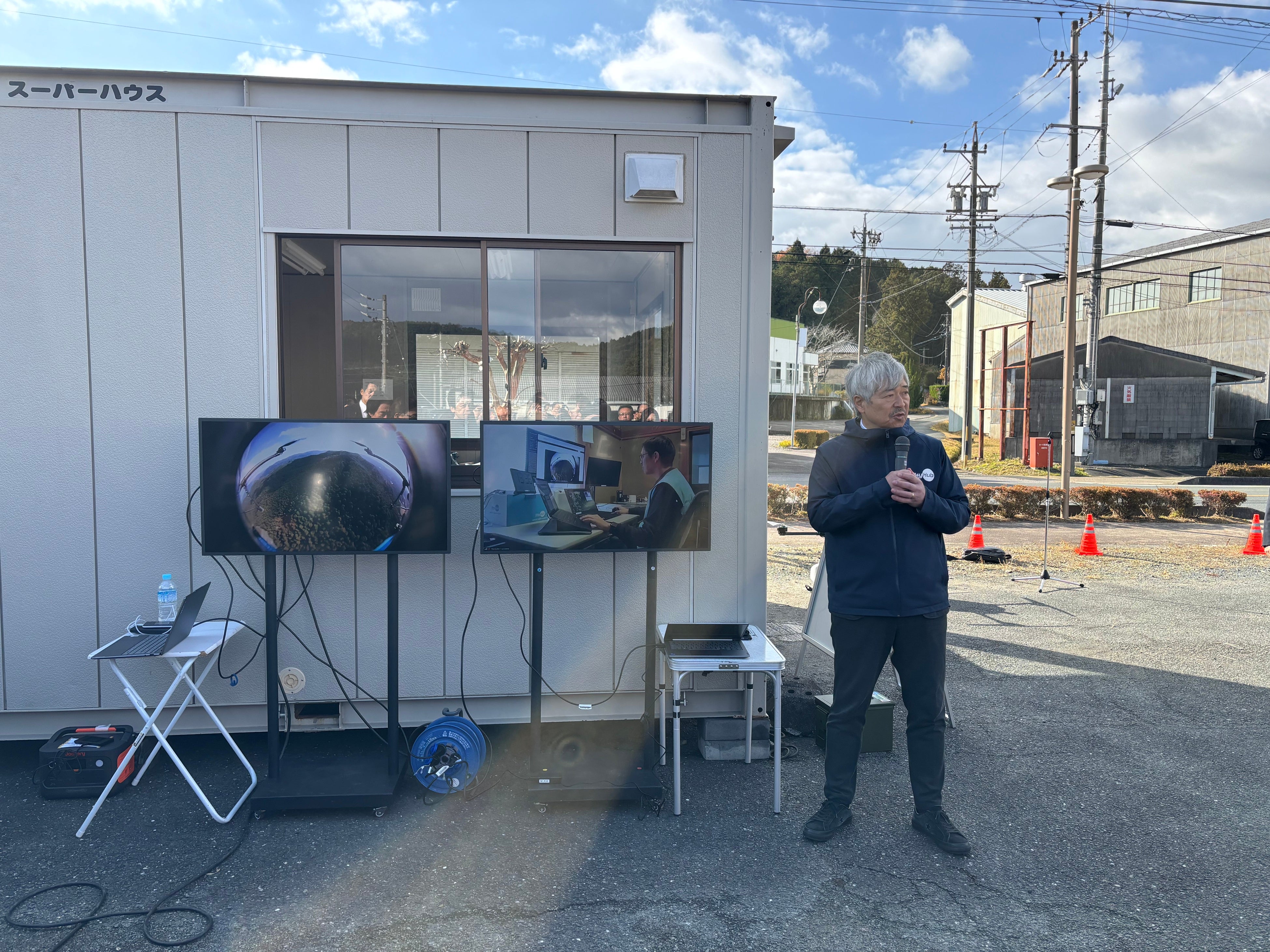 山梨県小菅村からの遠隔運航の様子とAirTruckの機上カメラ(FPV)のライブ映像を説明するNEXT DELIVERY代表取締役 田路 圭輔(Aコープ作手店 駐車場)