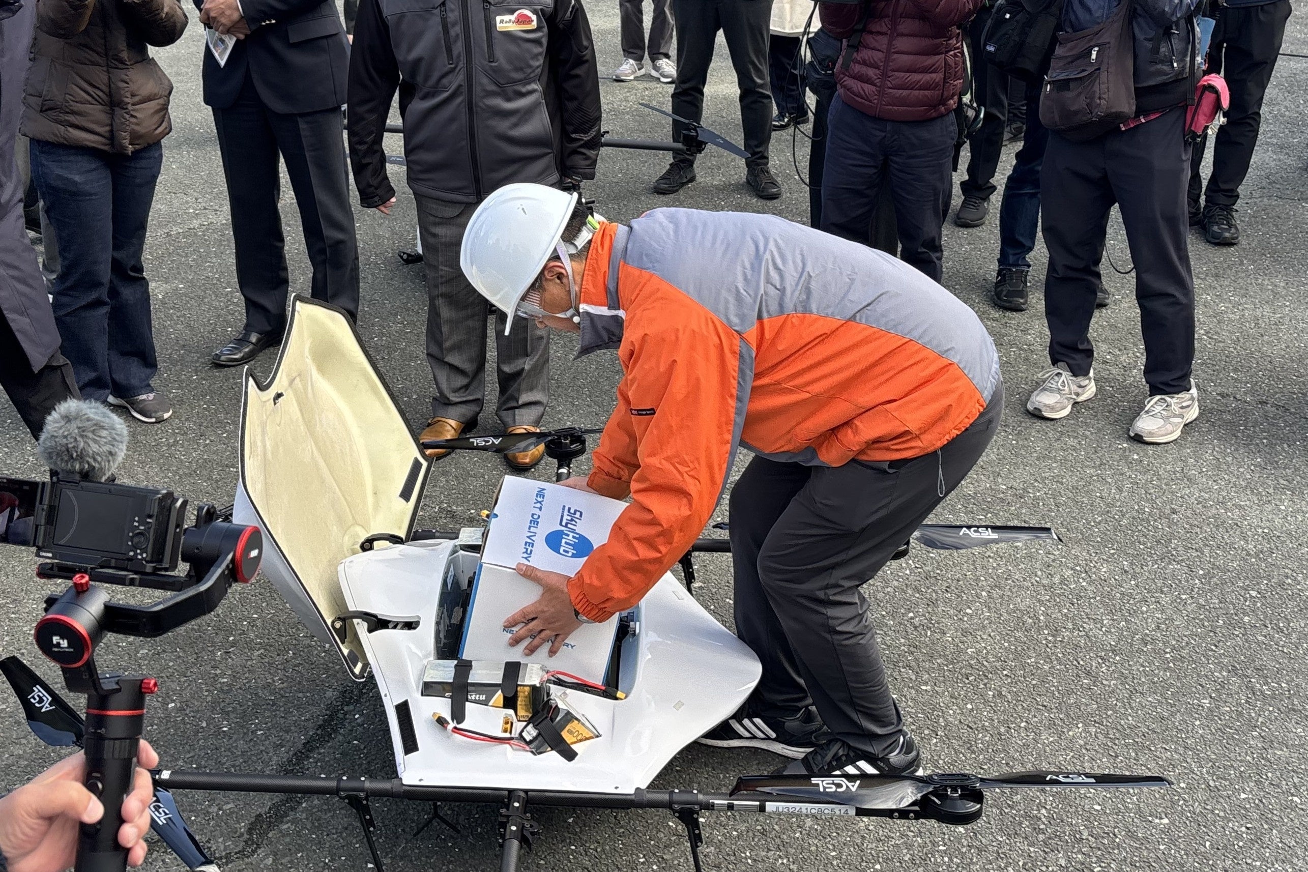 物流専用ドローン ”AirTruck”に荷物をセットするグリーンサービスのスタッフ(Aコープ作手店 駐車場)