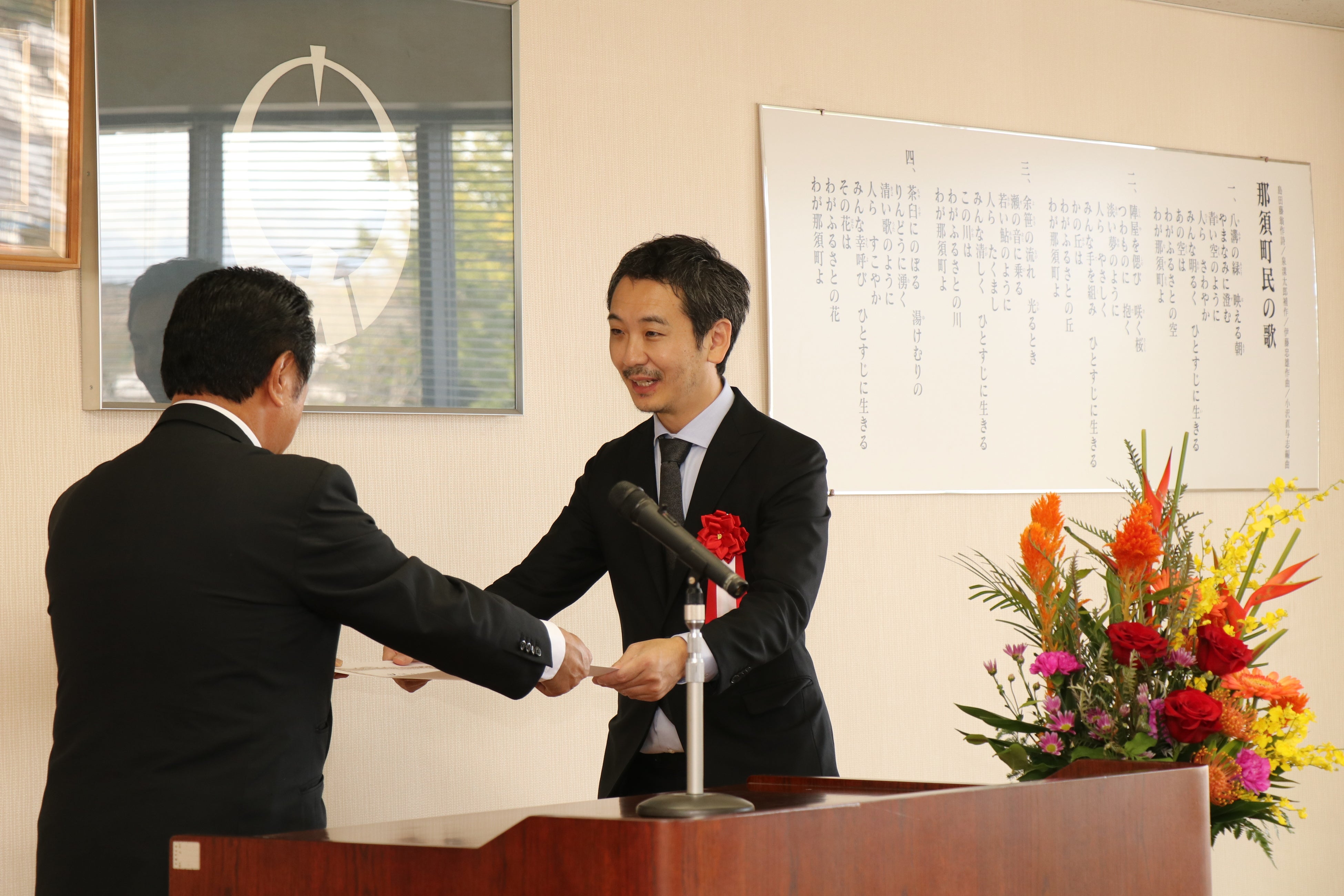 自治功労者表彰においては、本社を構える栃木県那須町内の小・中学校へ「バターのいとこ」「いとこのラスク」を寄贈した活動が評価され、那須町長より表彰をいただきました。