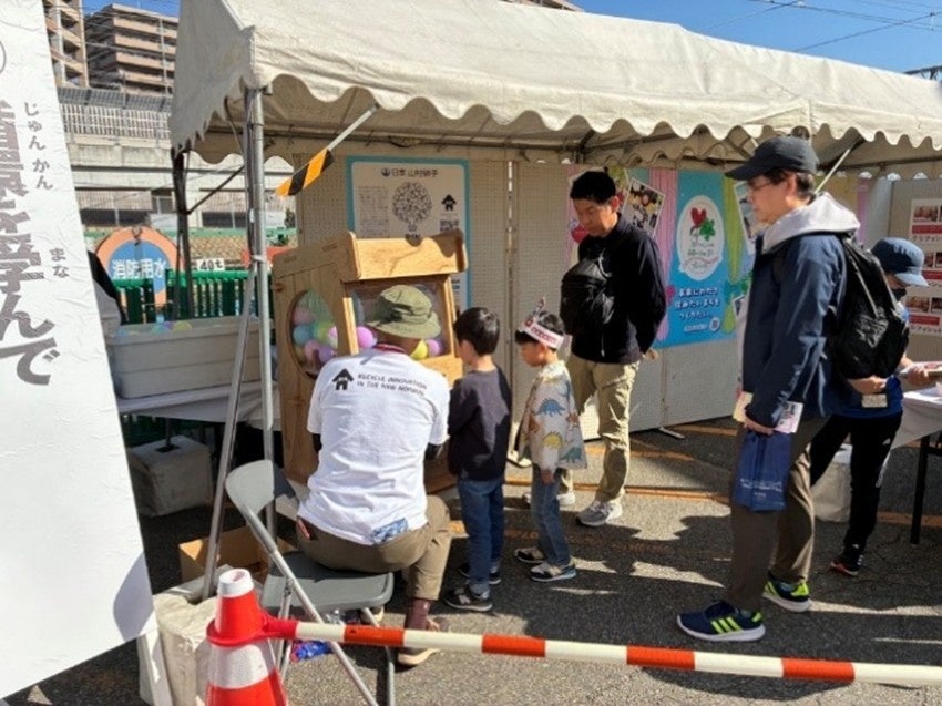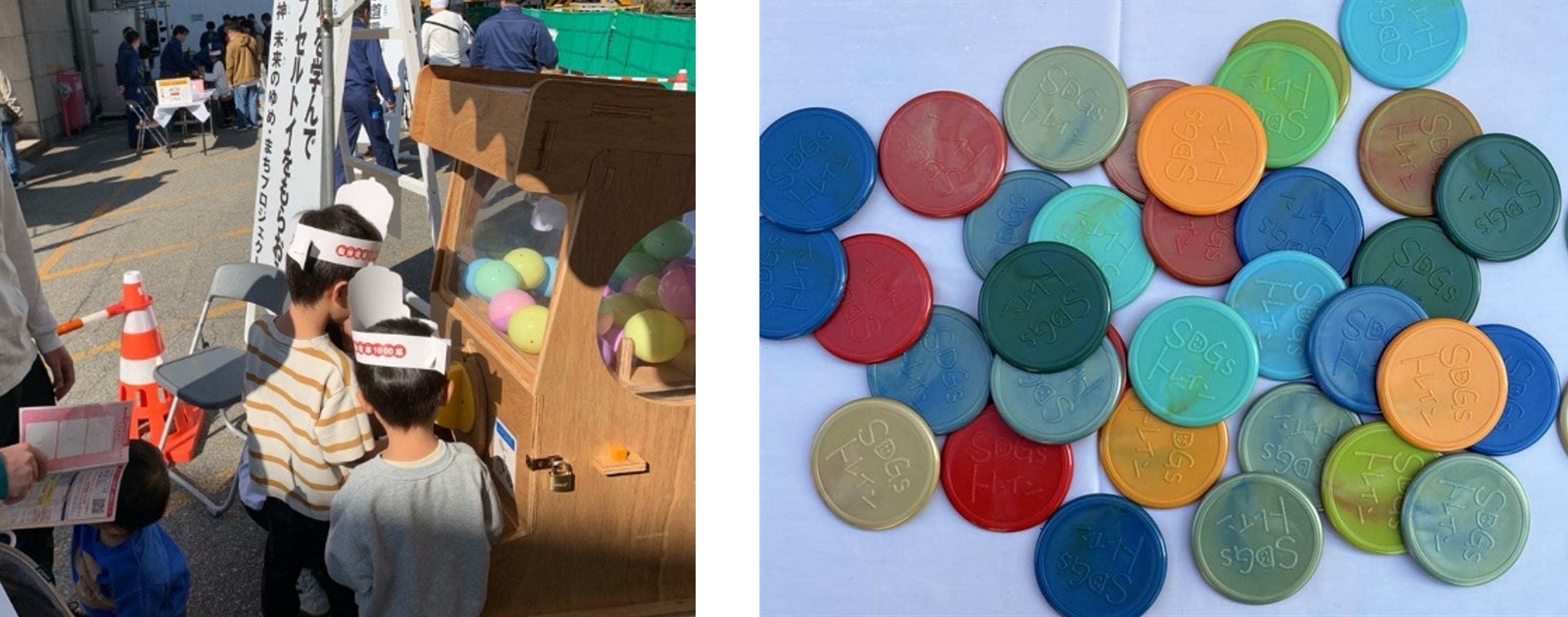 当社では、ペットボトルキャップのリサイクル活動(RIN)を通して循環型社会の実現を目指しており、今回はそうした想いのもと、未来世代に向けてSDGsの意義を楽しく伝えることを目的として「循環ガチャ」の提供および、景品のメダルの製作、ブース運営に協力しました。