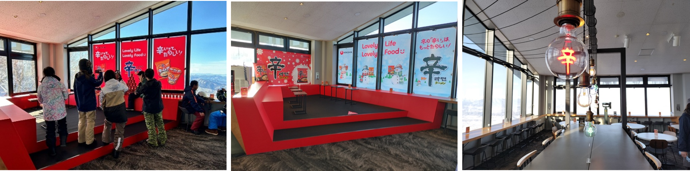 雪ゲレンデでウィンタースポーツを楽しんだ後、冷え切った体を温め、さらに雪山を楽しむ気持ちを高めてもらおうと始めた冬季限定コラボ企画。お客様からのHOTな声にお応えし、今シーズンも竜王スキーパークのオシャレな施設である雲の上のカフェレストラン「SORA terrace cafe」にて、“うまからっ!” な味わいで、心も体も芯からポカポカ温まる「辛ラーメン」の期間限定メニューを2種ご用意しました。真っ白いゲレンデとは対照的な写真映えする辛ラーメンカラーのコラボスペースも引き続き開設します。標高1,770mから眺める絶景とともに、ここだけの辛ラーメンコラボメニューをお楽しみください。