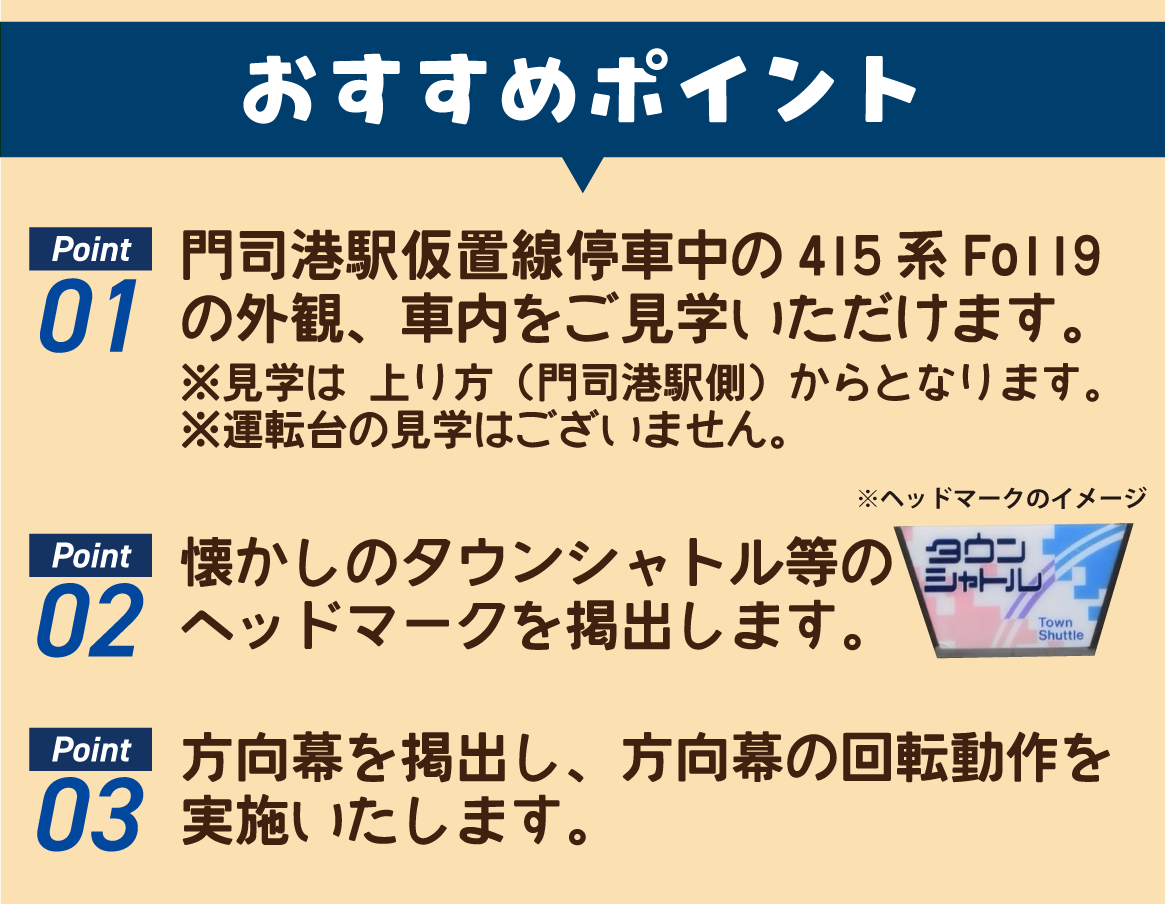 今回は「415系Fo119」車両の外観及び内観をご見学いただけます。見学会では懐かしのタウンシャトルのヘッドマーク掲出や方向幕の掲出も実施いたします。