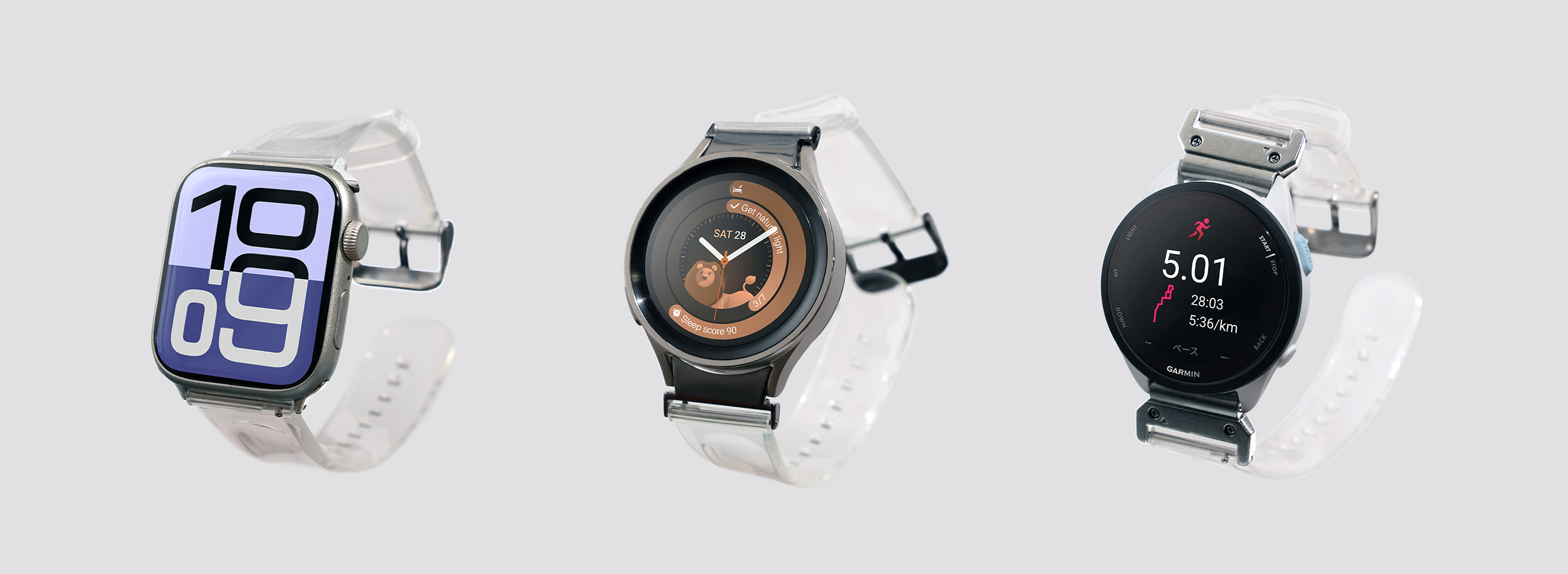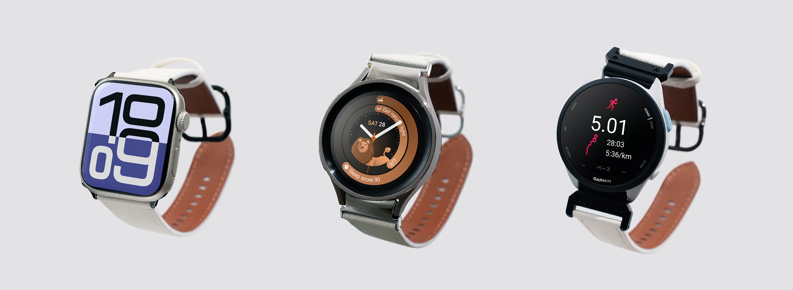 Apple Watch、Galaxy Watch、Garminなどのさまざまな機種にフィット。機種を選ばずカスタムを楽しめます。