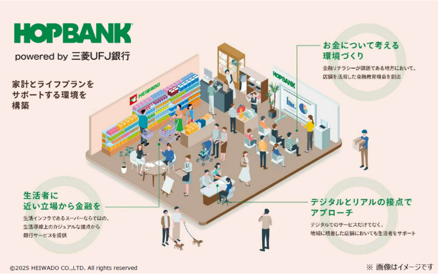 株式会社平和堂(本社:滋賀県彦根市、代表取締役社長執行役員CEO:平松正嗣、以下「平和堂」)と、株式会社三菱UFJ銀行(本社:東京都千代田区、取締役頭取執行役員:半沢淳一、以下「三菱UFJ銀行」)は、12月1日(月)より、スーパーマーケット業界初(※1)となる個人向け銀行サービス「HOPBANK powered by 三菱UFJ銀行(以下、HOPBANK)」の提供を開始しました。