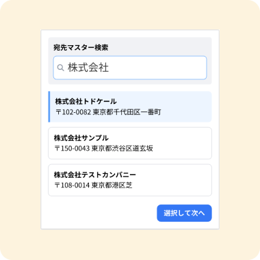 ⚫︎手入力ゼロの「選択式」入力宛先マスターからの選択で、ふりがな・住所の自動補完を実現し、入力ミスや書き間違えを根絶します。