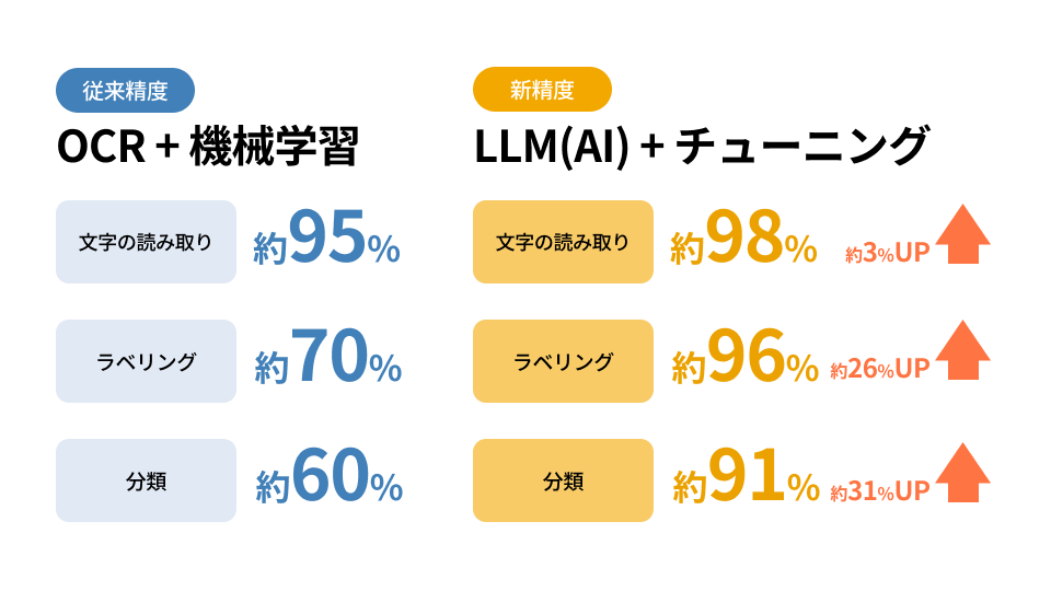 従来の「OCR+機械学習」による台帳作成と宛先推定の仕組みを刷新し、「LLM(AI)+チューニング」を導入することで、処理精度が飛躍的に向上しました。