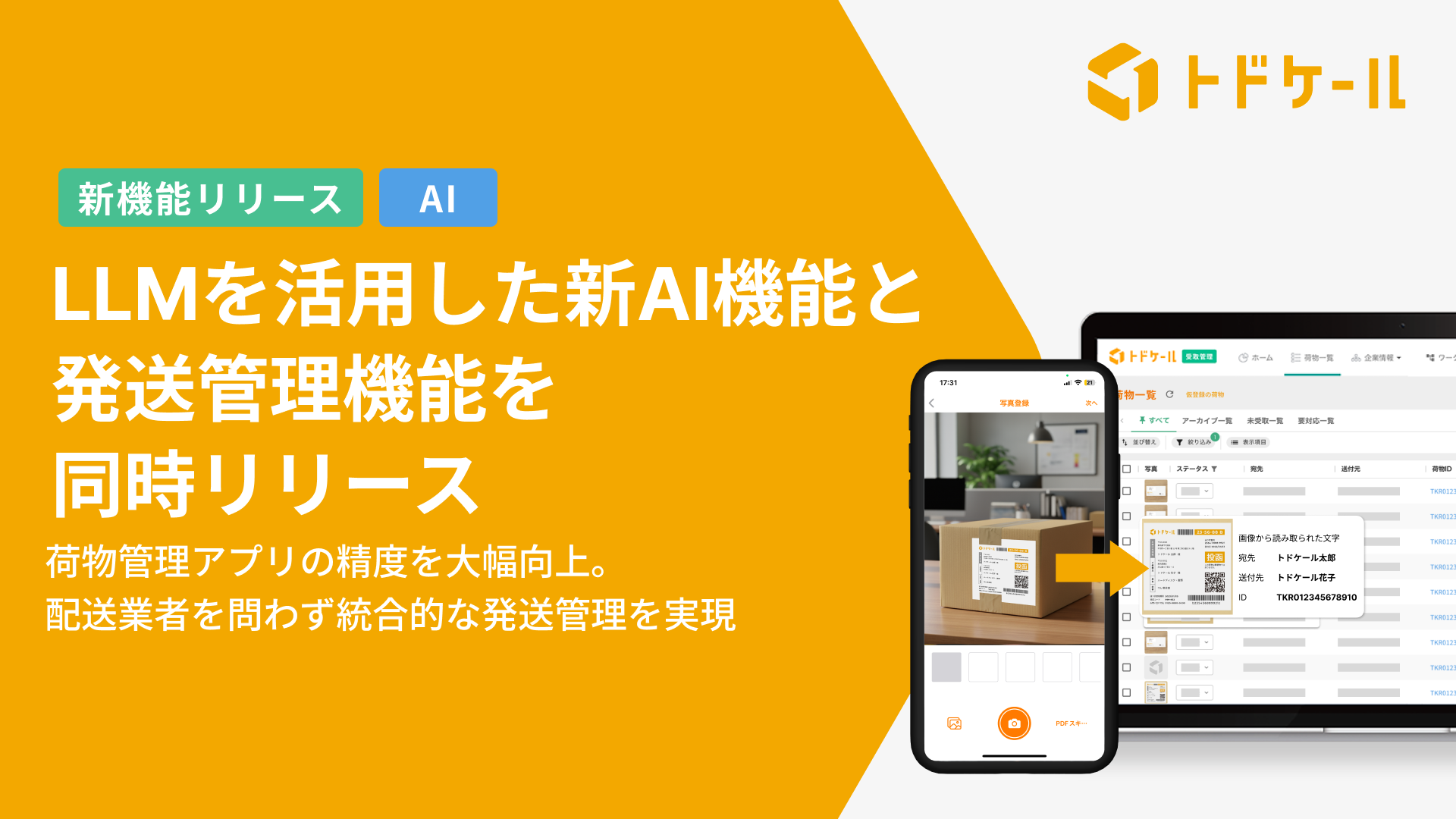 株式会社トドケール(本社:東京都千代田区、代表取締役:野島剛、以下トドケール)は、配達物・郵便物管理アプリ「トドケール」において、LLM(大規模言語モデル)を活用した新AI機能と、新たな発送管理機能を提供開始いたします。