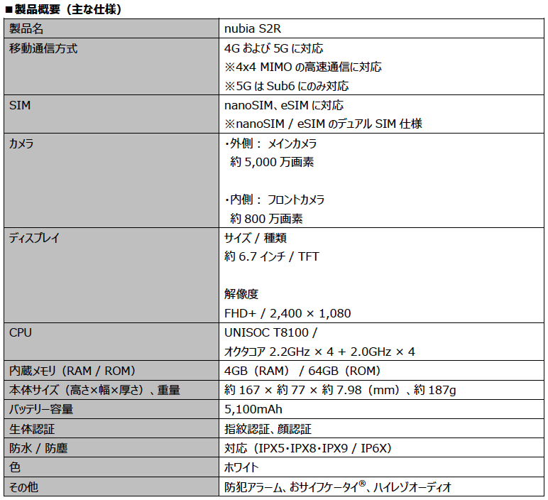 楽天モバイル株式会社(以下「楽天モバイル」)は、「楽天モバイル」公式サイトおよび「楽天モバイル公式 楽天市場店」にて、12月2日(火)午後2時より、ZTEが製造する「nubia S2R」の予約受付を開始しました。また、 「楽天モバイル」公式サイト、「楽天モバイルショップ」および「楽天モバイル公式 楽天市場店」にて、12月4日(木)午前9時より19,800円(税込)で発売します(注1、2)。本製品は、見やすい大画面と薄型軽量ボディ、そして高い耐久性を兼ね備えた5G対応スマートフォンです(注3)。なお、国内携帯キャリアにおける本製品の取り扱いは、楽天モバイルが唯一となります(12月2日時点、楽天モバイル調べ)。
