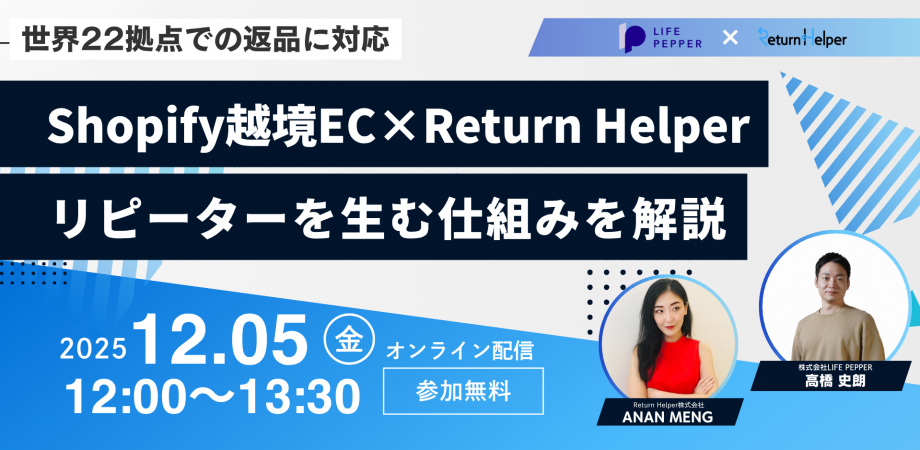 本ウェビナーでは、Shopifyを活用した越境販路の構築とマーケティング支援を行う株式会社LIFE PEPPERと世界22か所の現地倉庫ネットワークを活用した物流・返品ソリューションを提供するReturn Helper株式会社の共催でのShopifyでの