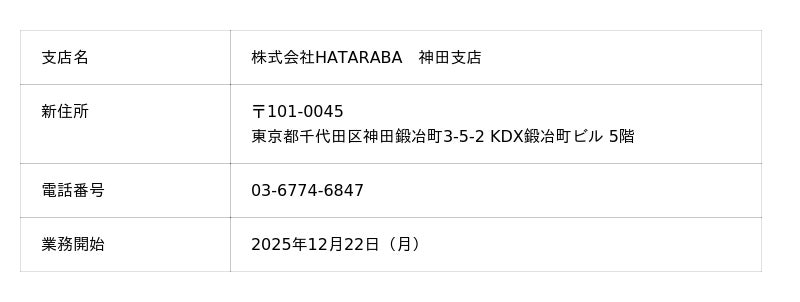 オフィス移転コンサルティングを手がける株式会社HATARABA(本社:東京都渋谷区渋谷、代表取締役:森村泰明)は、業務拡大と人員増加に伴う体制強化を目的に、日本橋支店を神田エリアへ拡張移転し、2025年12月22日(月)より新オフィスでの営業を開始いたします。