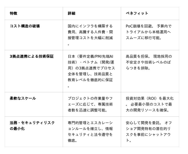 企業はオフショア技術者の採用・教育・管理といった間接的な負担を一切負うことなく、高品質な成果物を迅速に得られます。