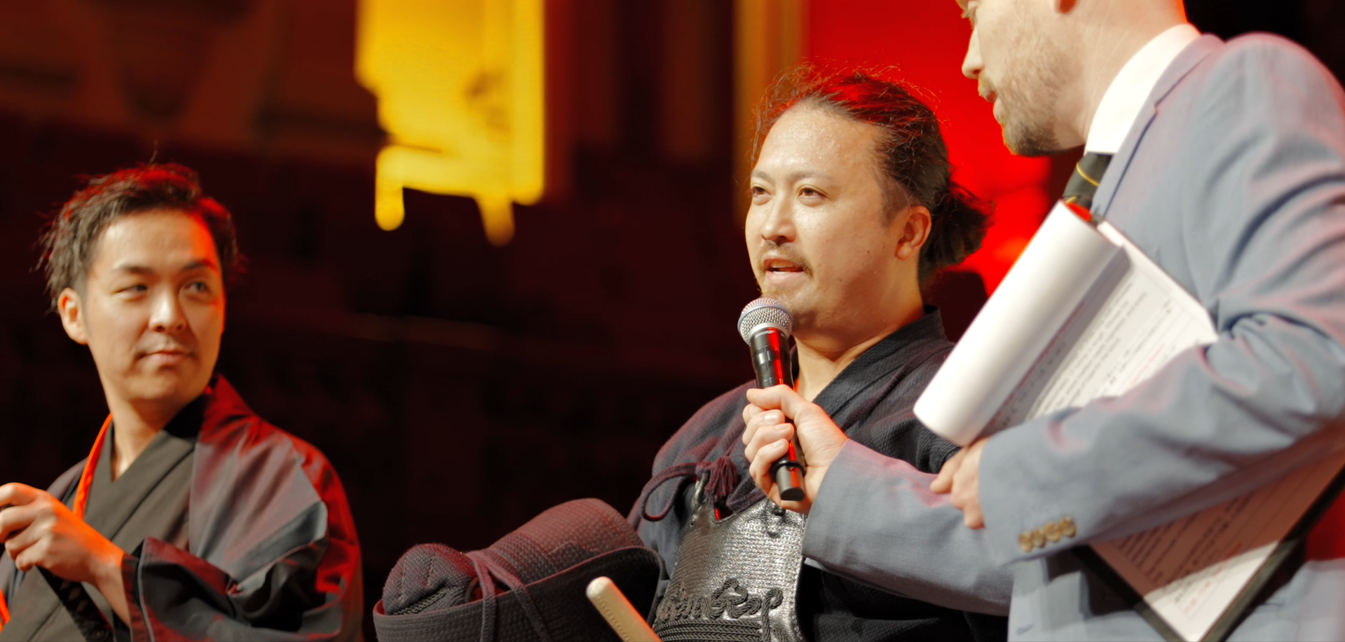 披露後には舞台上での特別インタビューが行われ、Kendo Experience マスターのToshiより剣道の魅力や精神性について熱く語られました。