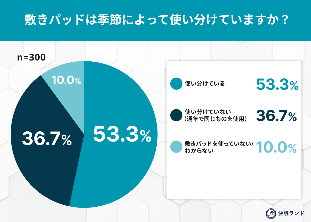 - 敷きパッドの普段の使用率は約9割└「使っていない」は1割にとどまり、多くの人にとって敷きパッドは“当たり前の寝具”になっている。- 敷きパッドを季節で使い分けている人は全体の約5割(53.3%)にとどまる