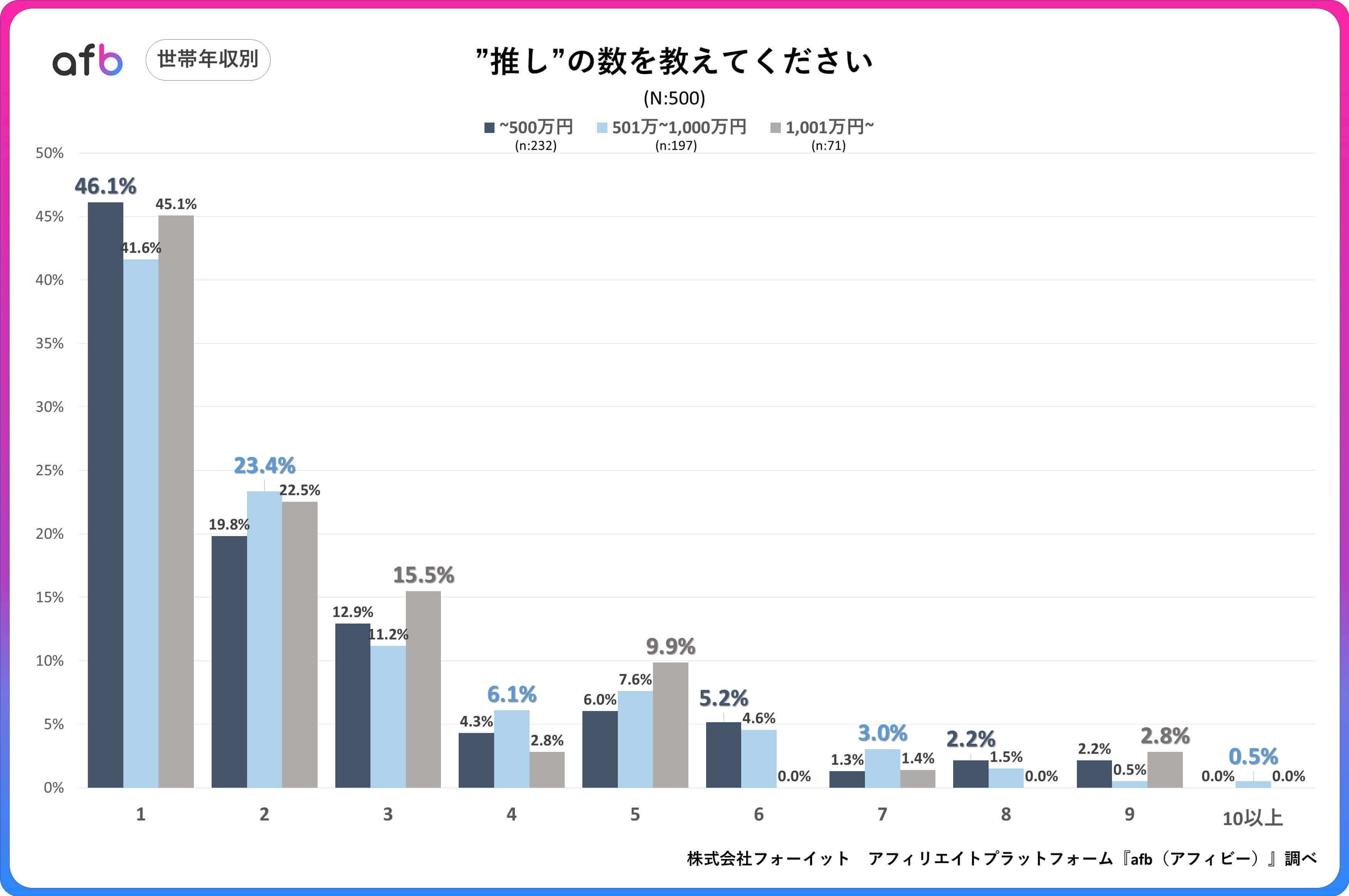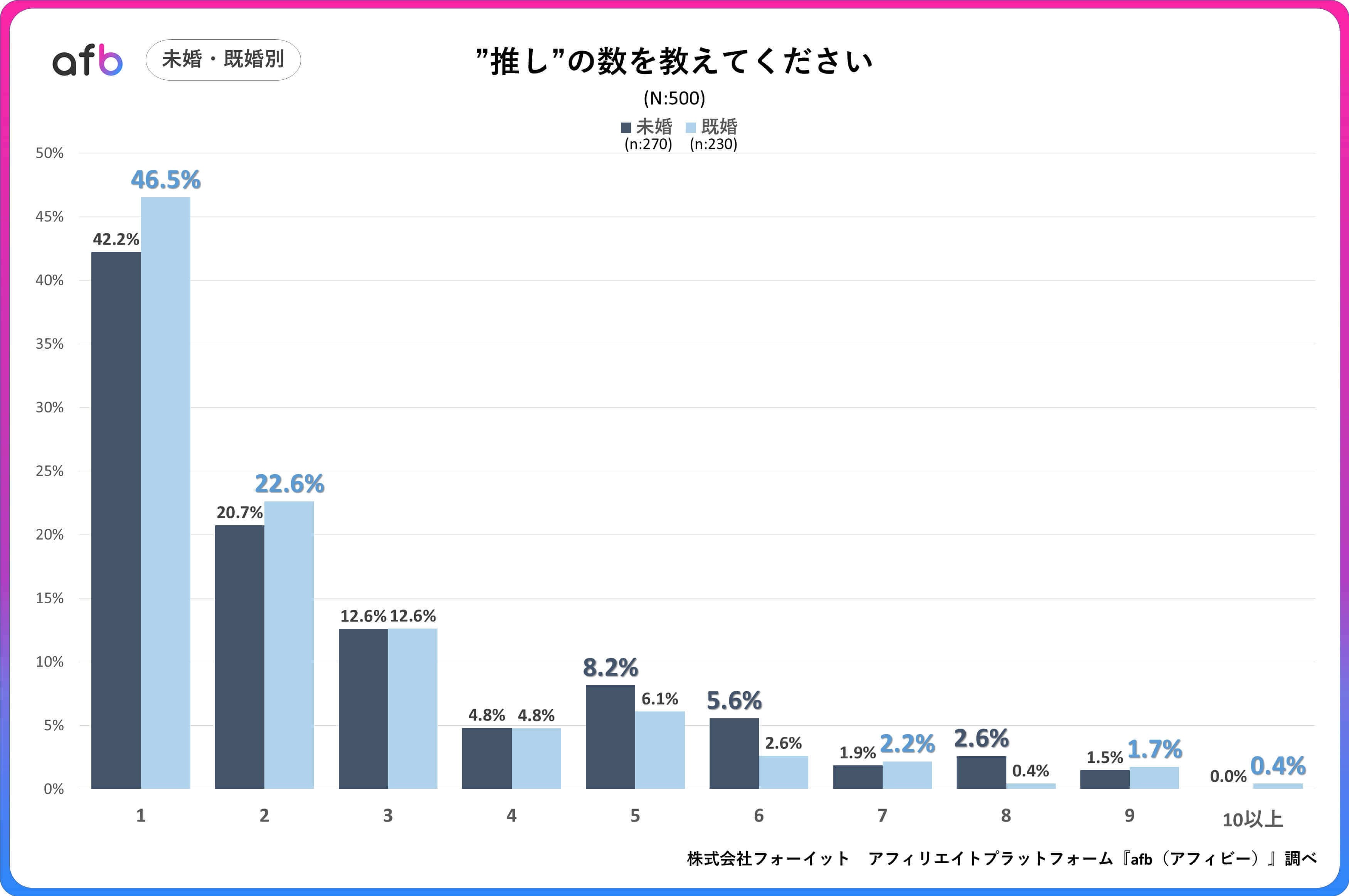 アフィリエイトプラットフォーム「afb(アフィビー)」< https://www.afi-b.com/ >の開発運用をおこなう株式会社フォーイットは、全国の20代~60代までの男女500人を対象に推し活に関するアンケートを実施し、年代別等の特徴についてまとめました。