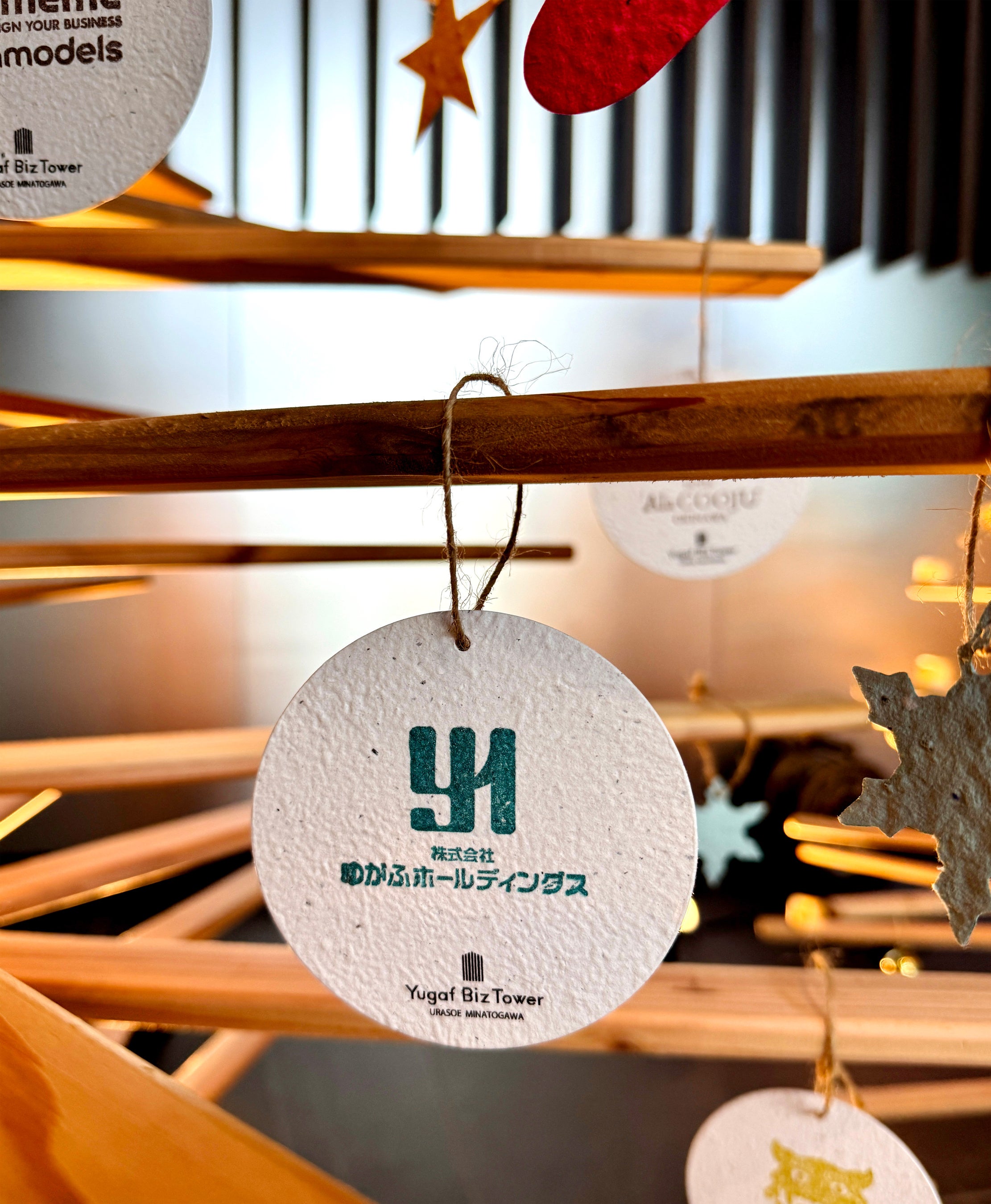 ツリーには、土に還る素材「シードペーパー」で作られたオーナメントを飾り付けています。