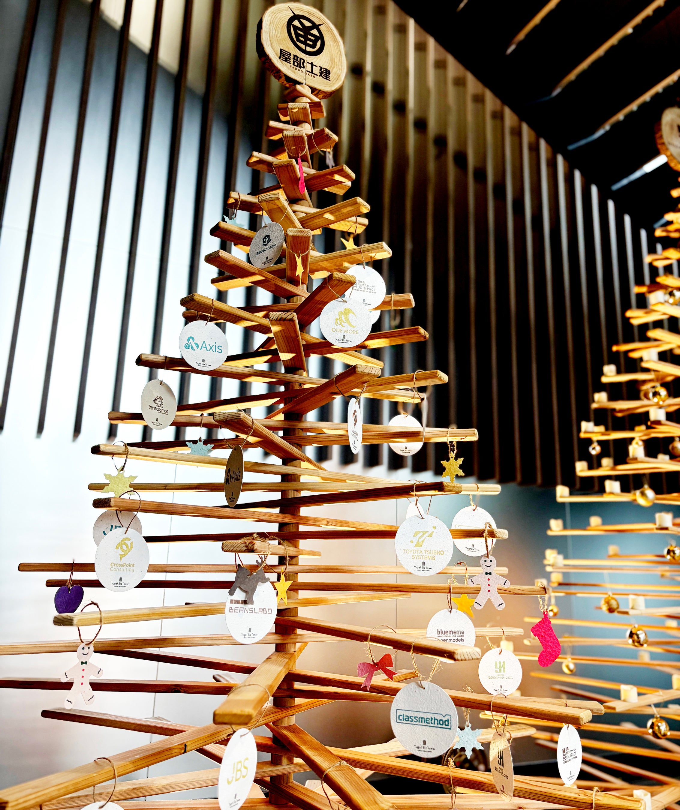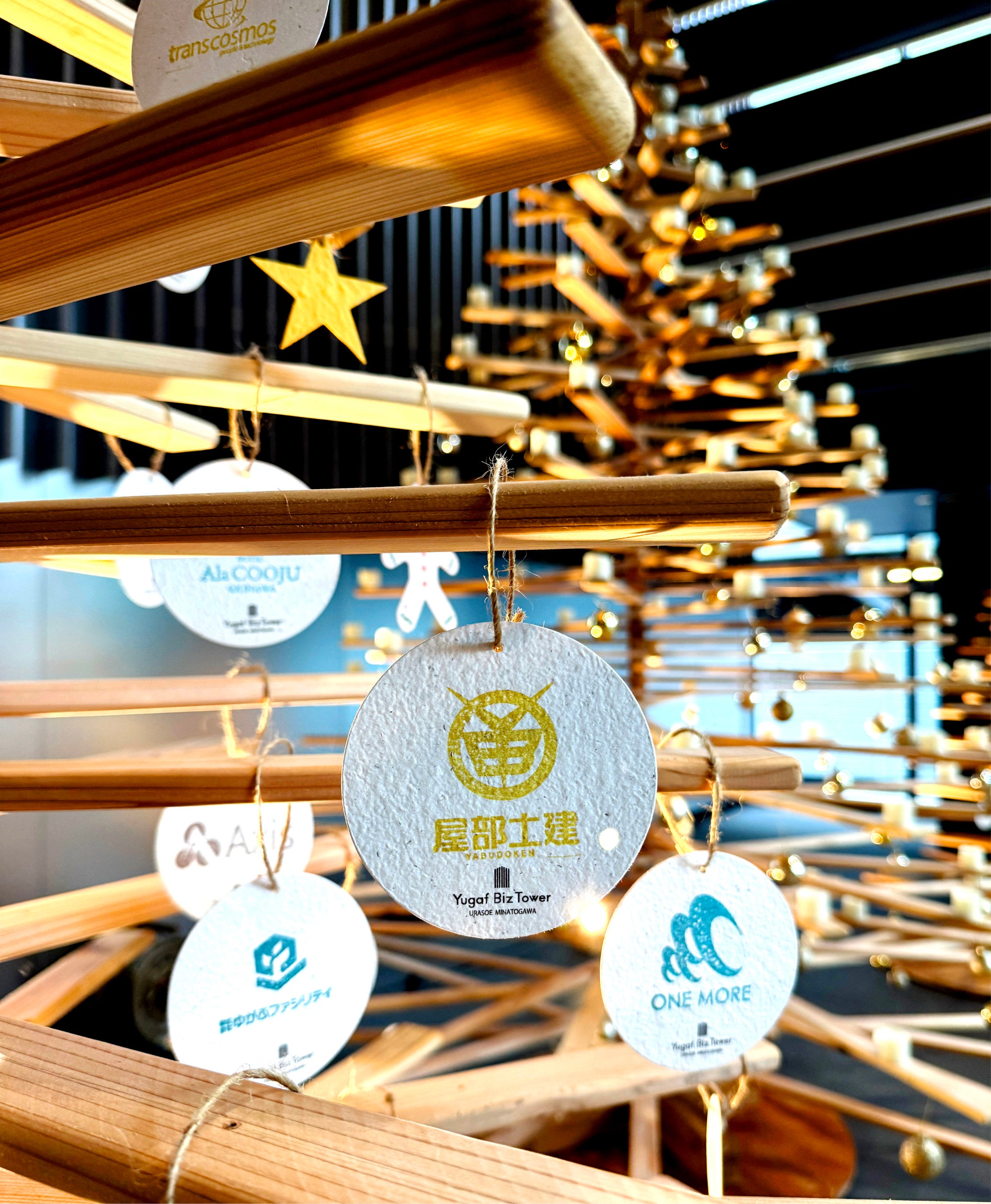 クリスマスモチーフに加え、屋部土建をはじめとするグループ企業、さらにゆがふBizタワー浦添港川にご入居いただいているホテルアラクージュオキナワやテナント企業様にご協力いただいたロゴ入りオーナメントが並び、自然素材ならではの落ち着きと温かみのある空間を創り出しています。