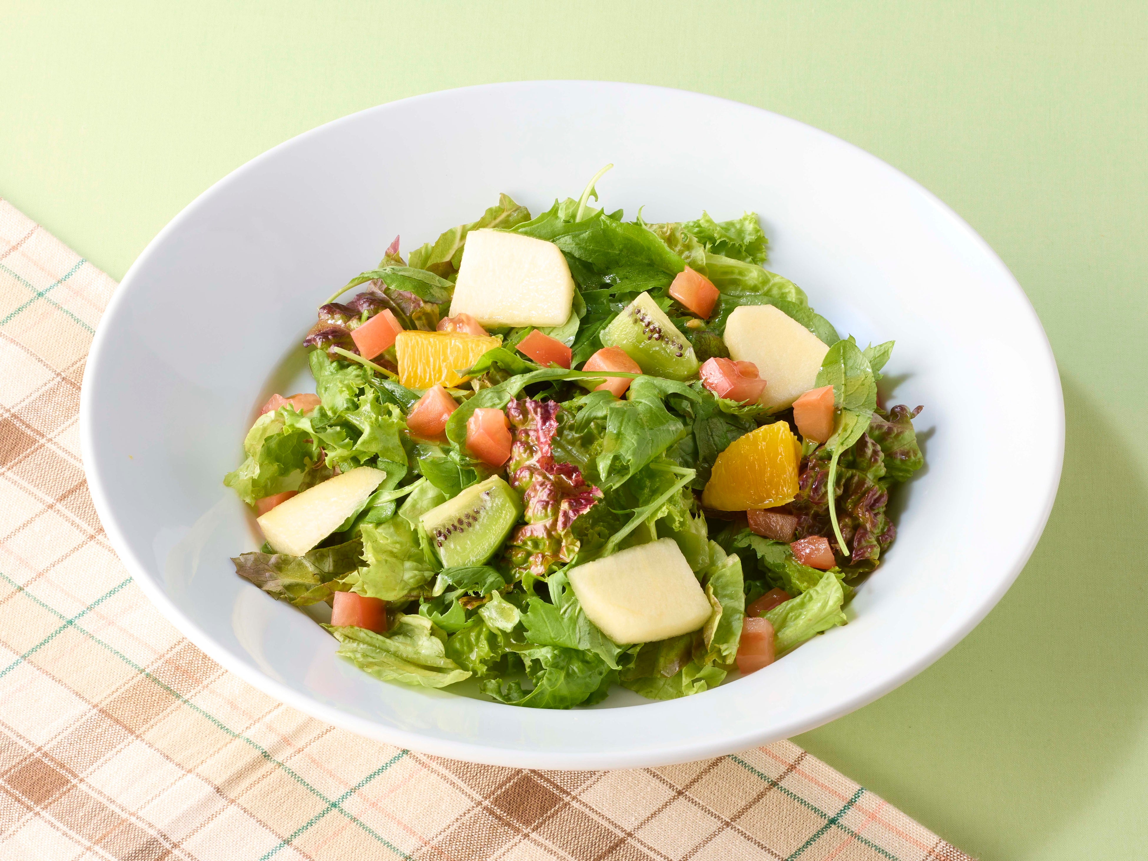 フレッシュフルーツを使用した彩り豊かなサラダです。野菜とフルーツがマッチするように、オレンジ果汁とはちみつを使った特製のオレンジハニーソースを合わせています。