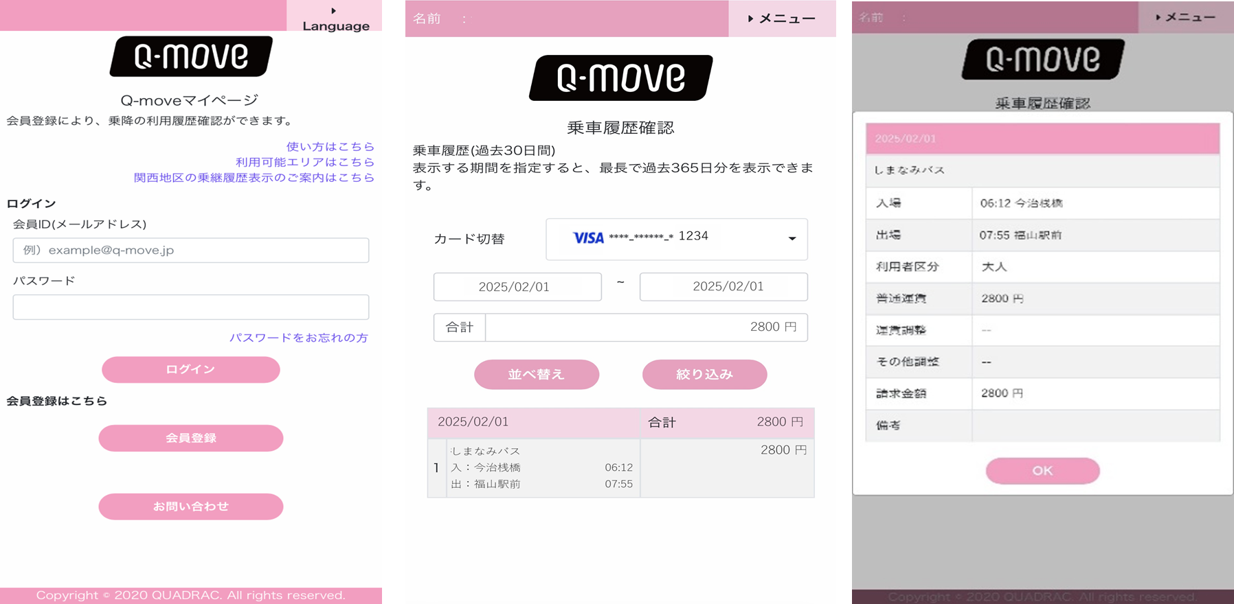 QUADRACのQ-moveサイト(https://q-move.info/)にアクセスし、マイページの会員登録手続きが完了しますと確認可能です。