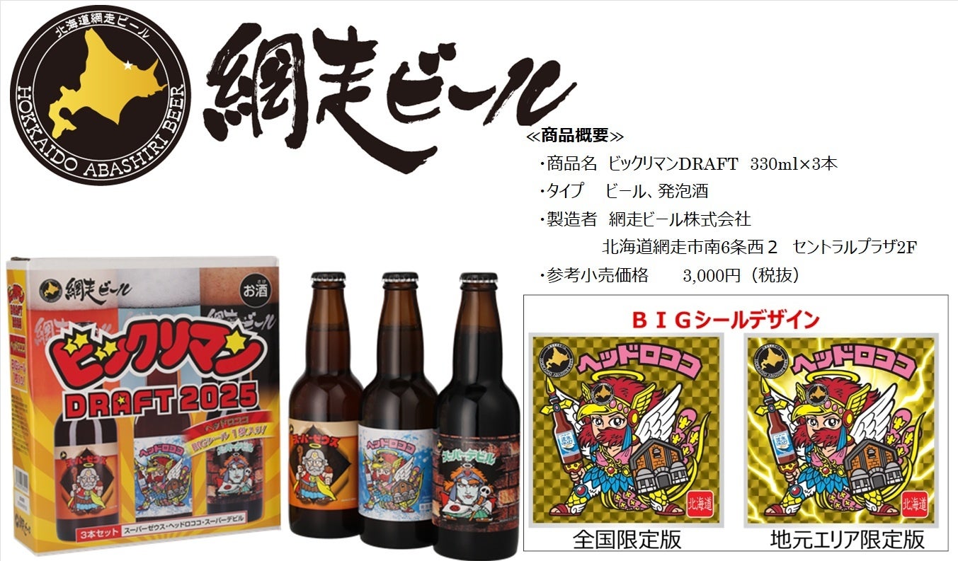 株式会社SBS(東京都中央区/代表取締役会長 吉田和司)は、全国6社の酒類メーカー(北海道:網走ビール株式会社、岩手県:上閉伊酒造株式会社、山梨県:株式会社萬屋醸造店、富山県:吉乃友酒造有限会社、熊本県:千代の園酒造株式会社、沖縄県:久米仙酒造株式会社と、株式会社ロッテ(本社:東京都新宿区/代表取締役社長執行役員 中島英樹)と組み、2025年9月より数量限定発売しました、ビックリマン地方創生企画第7弾、【JAPANクラフト酒企画 (悪魔VS天使)】の企画第2弾!北海道:網走ビール株式会社(代表取締役:長岡拓児)から、ビックリマンDRAFT2025 330ml×3本セットが、2025年12月12日に数量限定発売ることをお知らせいたします。