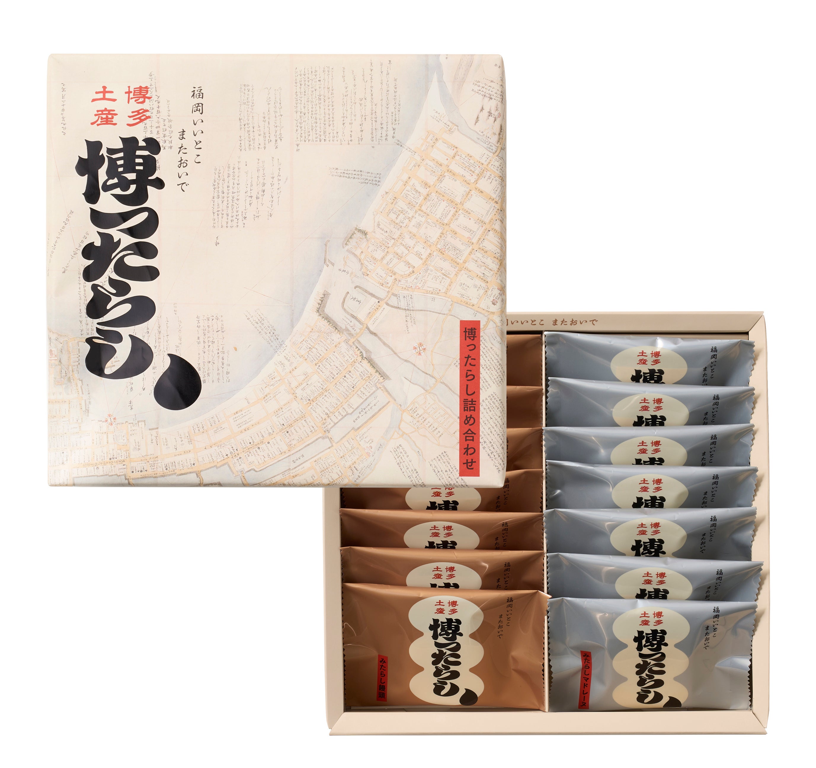 ブランドを代表する焼き菓子2種が味わえる「博ったらし詰め合わせ14個入」は、博多の古地図をそのまま印刷した包装紙でお包みしました。まるで、“博多そのものを持ち帰る”ような 気持ちになれる、この場所への愛を込めた「新・博多土産」としてお届けいたします。