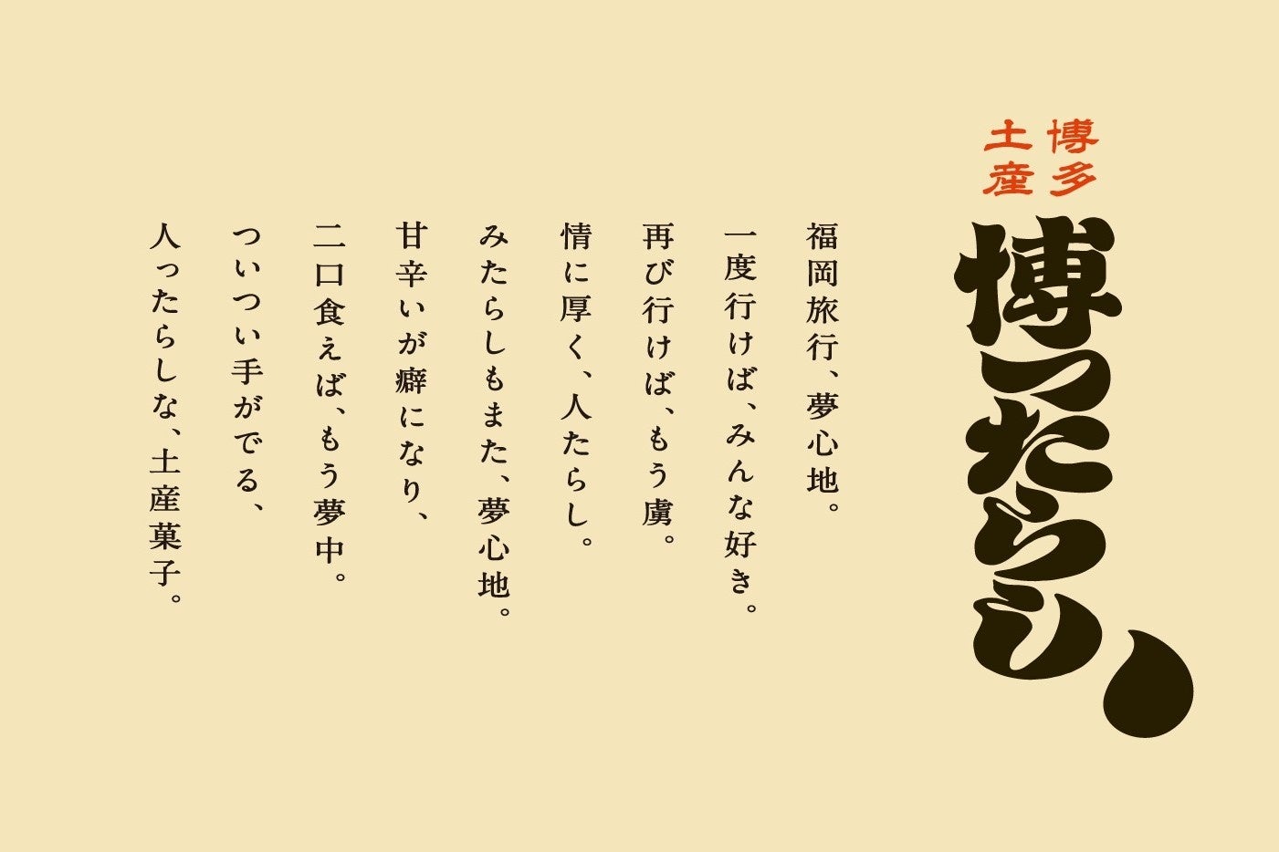 甘辛さが癖になる“みたらし”の魅力と、情に厚く、人の心つかむ“博多”らしさ。どちらも一度味わえば、もう一度欲しくなる――。その、人を惹きつける魅力を重ね合わせました。