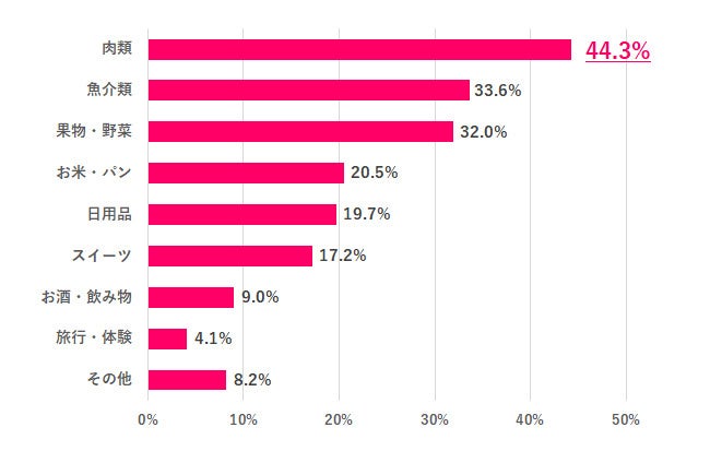 ふるさと納税の返礼品でよく選ぶものを聞いたところ、1位「肉類」44.3%、2位「魚介類」33.6%、3位「果物・野菜」32.0%で、日常で使う食品が上位を占めました。「日用品」や「旅行・体験」など、食品以外のものを選ぶ人は少数派でした。その他のコメントには、「家電」「化粧品」「寄付」などがありました。