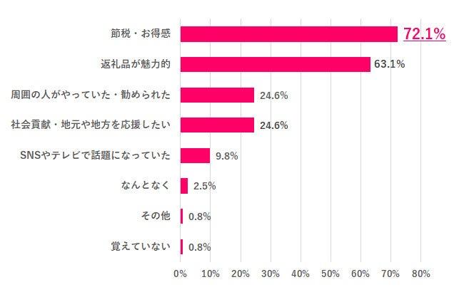 ふるさと納税をしたことがある人に、ふるさと納税を始めたきっかけを聞いたところ、1位「節税・お得感」72.1%、2位「返礼品が魅力的」63.1%、3位「周囲の人がやっていた・勧められた」24.6%、「社会貢献・地元や地方を応援したい」24.6%でした。