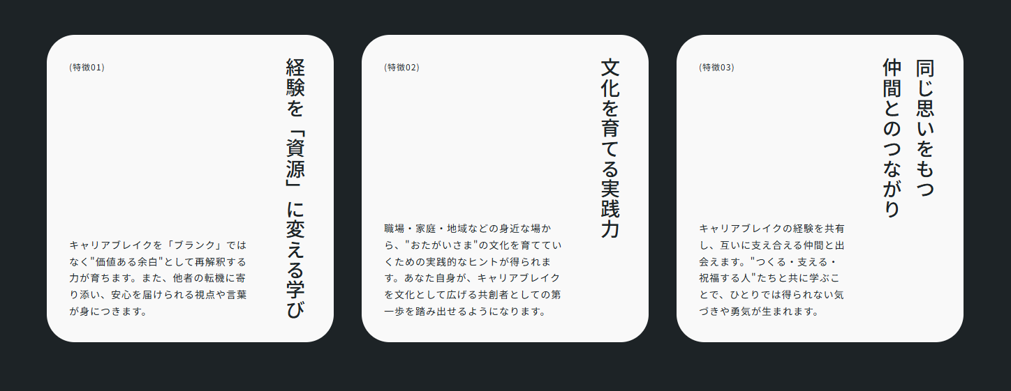 [画像2: https://prcdn.freetls.fastly.net/release_image/109583/13/109583-13-bf7437aa9581c8c73c8aec62ea2fc010-1448x561.png?width=536&quality=85%2C75&format=jpeg&auto=webp&fit=bounds&bg-color=fff ]経営者・人事系・地方・行政・個人など、キャリアブレイクはスルーできないテーマになっています。