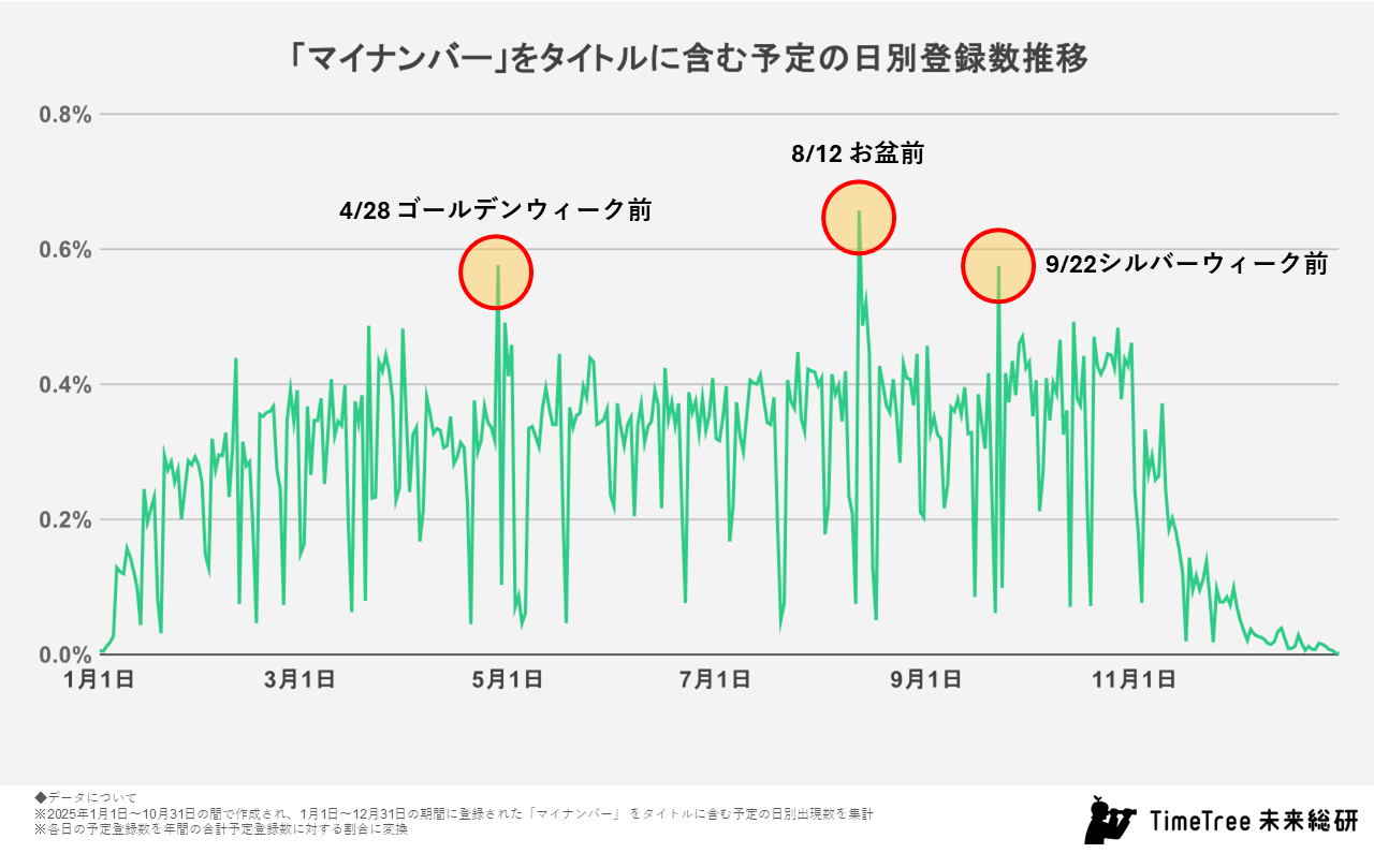 「マイナンバー」を含む予定の登録数推移を日別で見ると、ゴールデンウィークに入る直前の4月28日やお盆休暇に入る前の8月12日、シルバーウィーク中日の9月22日に予定登録が集中しており、役所が休みに入る前に手続きを済ませようとした人が多かったことが読み取れます。