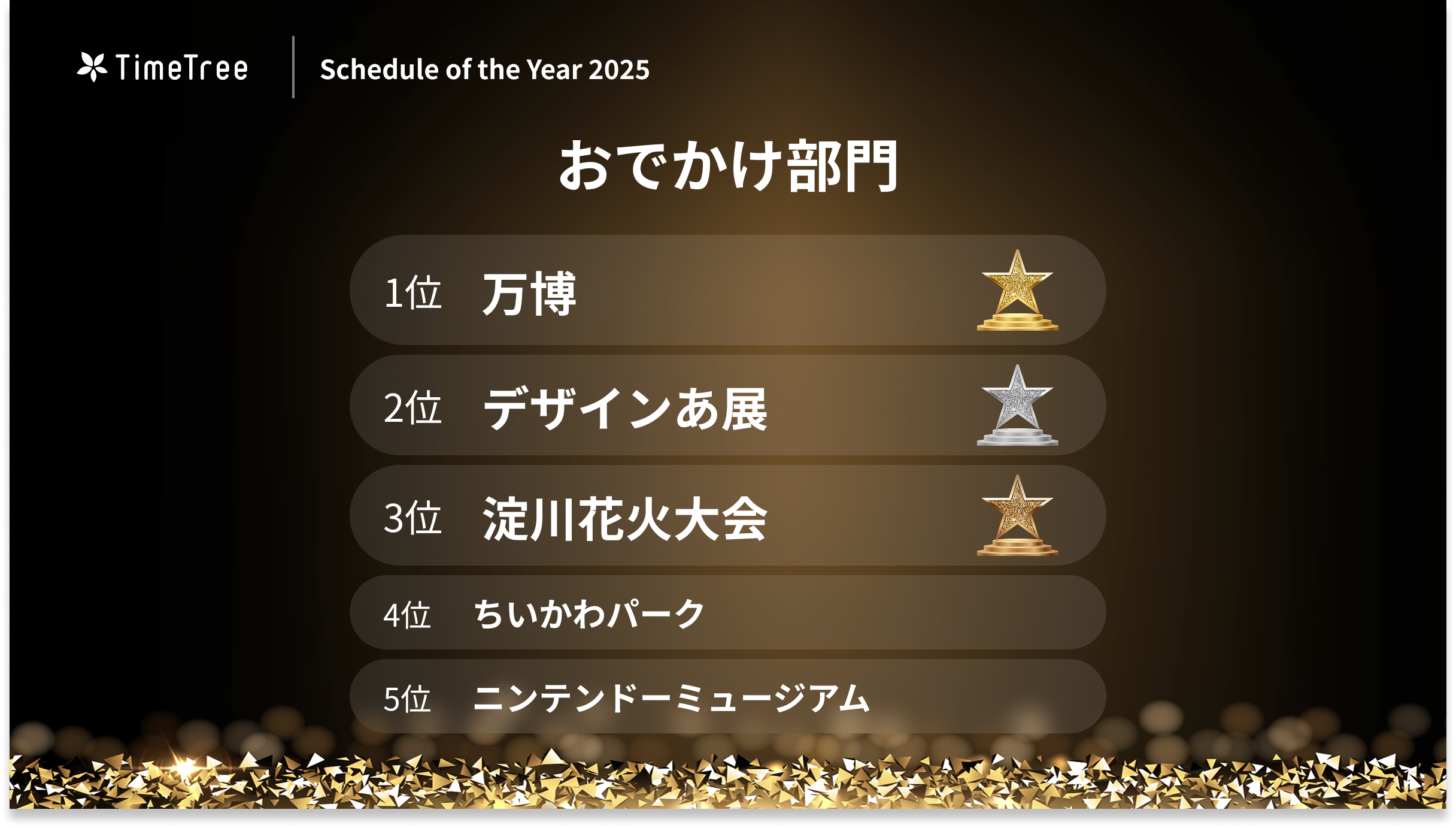 おでかけ先のイベントや施設などの予定を対象とした「おでかけ部門」では、Schedule of the Yearにも輝いた「万博」が1位に。