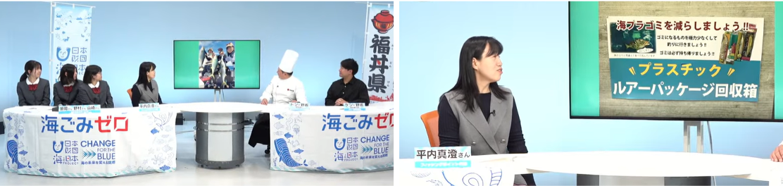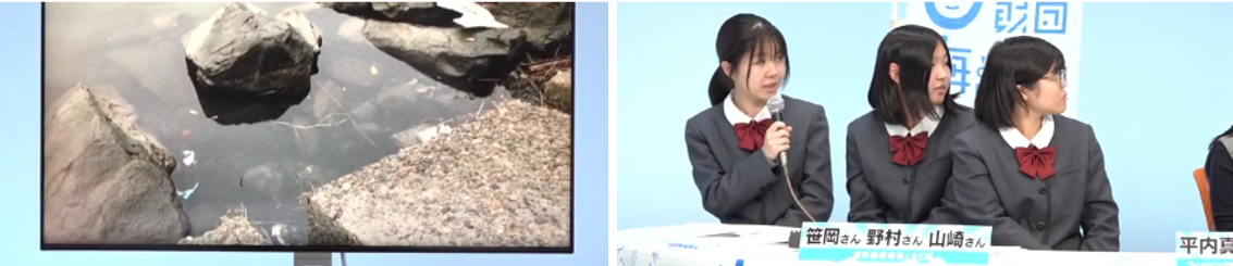 続いて、福井商業高校JRC部の活動を紹介しました。彼女たちは年間約20回も海岸清掃を行っています。「12月から5月にかけては大変多くのゴミが漂着します」と野村さんは説明します。福井商業高校の調査によると、海岸のプラスチックごみが占める割合は2017年の約70%から、2024年には95%を超え、問題は年々深刻化しているといいます。特に問題となっているのがペットボトルです。ごみ1kgあたりのペットボトルの本数は、2017年の0.5本から昨年は2.5本と約5倍に増加。さらに、ラベルやキャップから生産国を調査すると、日本のものは約10%前後で、ほとんどが国外からのものだという事実が明らかになりました。笹岡さんは「ペットボトルを含むプラスチックの問題は世界中で対策していくべきことだと強く感じています」と訴えました。釣りもするという山崎さんは、釣り人の視点から「表だったところには見えなくても、岩の隙間などにめちゃくちゃゴミが落ちています。釣り具のパッケージも落ちているので、やめてほしいと思います」と、マナーの問題にも言及しました。彼女たちの真摯な活動に対し、平内さんは「年に20回というのはなかなかできない。私たちももっと頑張らないといけない」と感銘を受けた様子でした。[画像3: https://prcdn.freetls.fastly.net/release_image/161057/412/161057-412-bbd48f4f574a1b6bc06e03911b7c6742-1133x245.png?width=536&quality=85%2C75&format=jpeg&auto=webp&fit=bounds&bg-color=fff ]