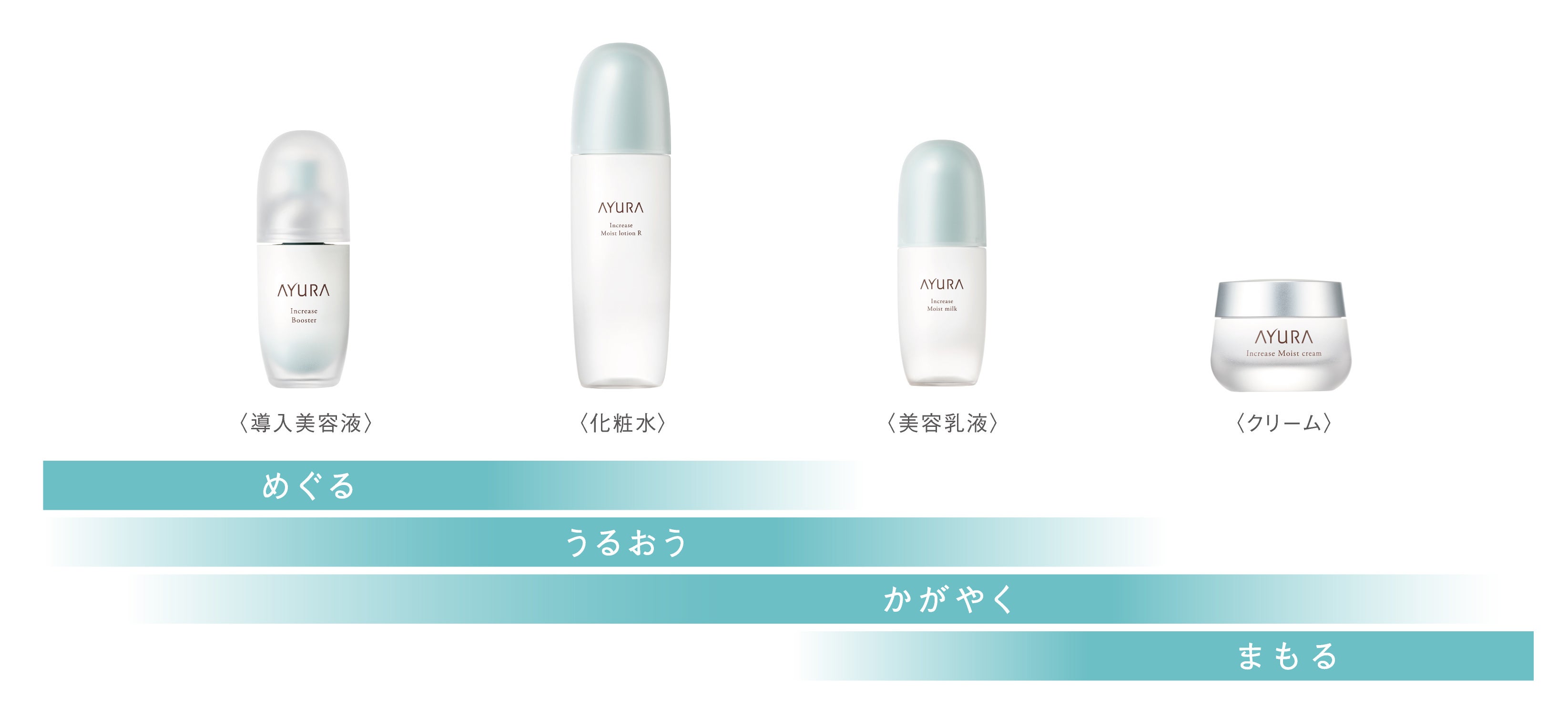 「インクリーゼ(INCREASE)」は、「増やす・育む・広げる」という意味をもつ英単語 increase に由来。肌のしなやかさを維持して、年齢を重ねるほどに美しさが「増えていく」ようにという願いを込めています。