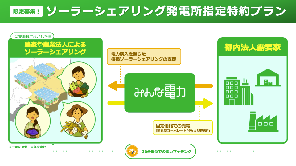本プランは東京都の助成のもと、関東エリアを中心に農家や農業法人が新規開発する地域と共生した優良なソーラーシェアリング発電所から再エネ電力を調達し、都内の法人需要家に特約プランとして3年間固定価格で供給するものです。