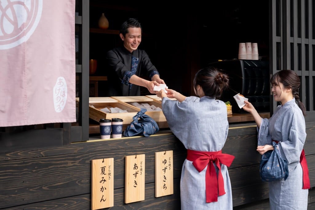 2020年3月12日に山口県、長門湯本温泉に開業。江戸時代には藩主も湯治に訪れたとされる長門湯本温泉。本陣として使われた御茶屋敷をテーマにした設えや、藩士達にも愛された赤間硯の体験からも武家文化を感じることが出来ます。また、魅力的な温泉街の一部になることを目指し、「温泉街そぞろ歩き」を楽しめるコンテンツの一つとして、界ブランドで初めて宿泊者以外の方も利用できる「あけぼのカフェ」を併設。このカフェでは山口県らしさを感じていただける「ゆずきち」や「夏みかん」のジャムを使った、どらやきを販売しています。甘さの中にほのかな酸味を感じる味わいのどらやきとともに、温泉街のそぞろ歩きを楽しむことができます。